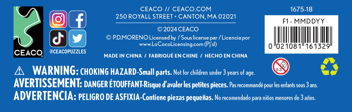 Details: Welcome to Ceaco! We are so grateful that you have found your “fit” here. Since our start in 1987 we have remained true to our mission: to create high quality, innovative and challenging jigsaw puzzles and to provide hours of family fun. We pride ourselves on developing and maintaining long standing relationships with some of the finest artists of our time. Our talented team of designers and marketing professionals are always searching the world over for developing trends, emerging artwork, and new technologies involving printing, die cutting, and unique puzzle materials. Our purpose is clear: to continue to be in the forefront of our industry and create a product that combines family entertainment with a distinctive aesthetic. Count on Ceaco for the most creative, exciting, and colorful products ever! Thanks and happy puzzling!