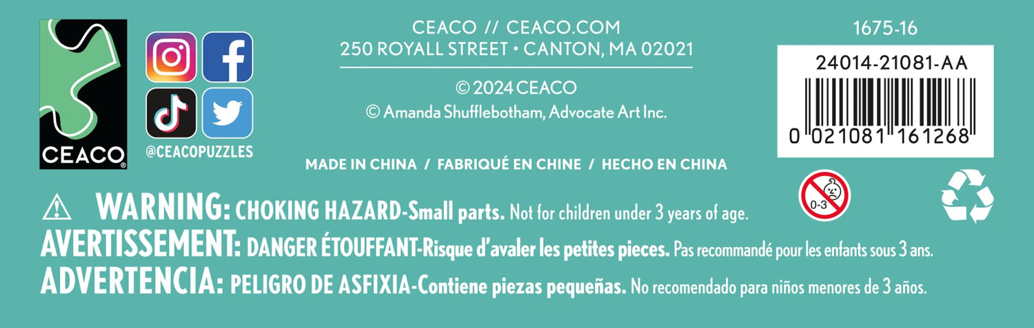 Details: Welcome to Ceaco! We are so grateful that you have found your “fit” here. Since our start in 1987 we have remained true to our mission: to create high quality, innovative and challenging jigsaw puzzles and to provide hours of family fun. We pride ourselves on developing and maintaining long standing relationships with some of the finest artists of our time. Our talented team of designers and marketing professionals are always searching the world over for developing trends, emerging artwork, and new technologies involving printing, die cutting, and unique puzzle materials. Our purpose is clear: to continue to be in the forefront of our industry and create a product that combines family entertainment with a distinctive aesthetic. Count on Ceaco for the most creative, exciting, and colorful products ever! Thanks and happy puzzling!