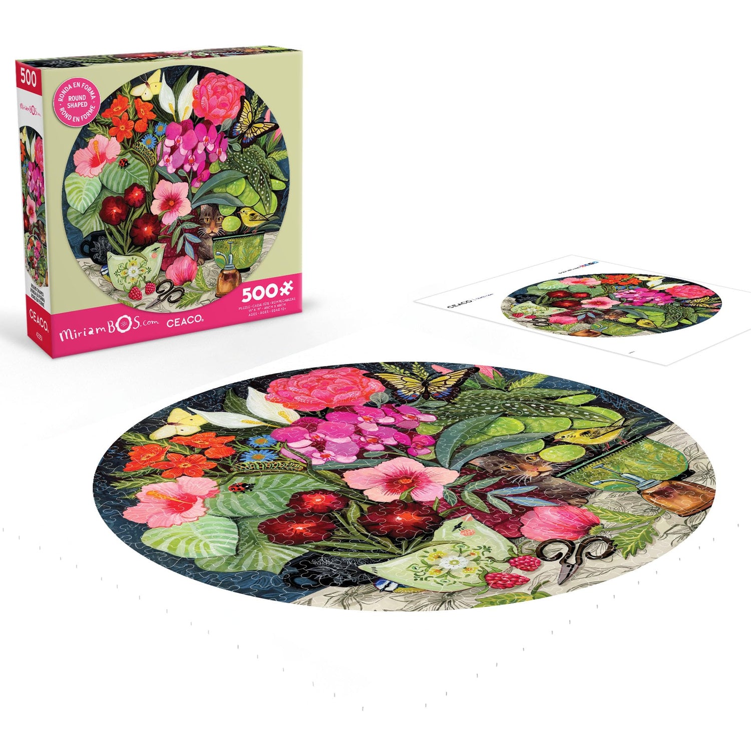 - Contains a 500 piece round jigsaw puzzle by Miriam Bos.