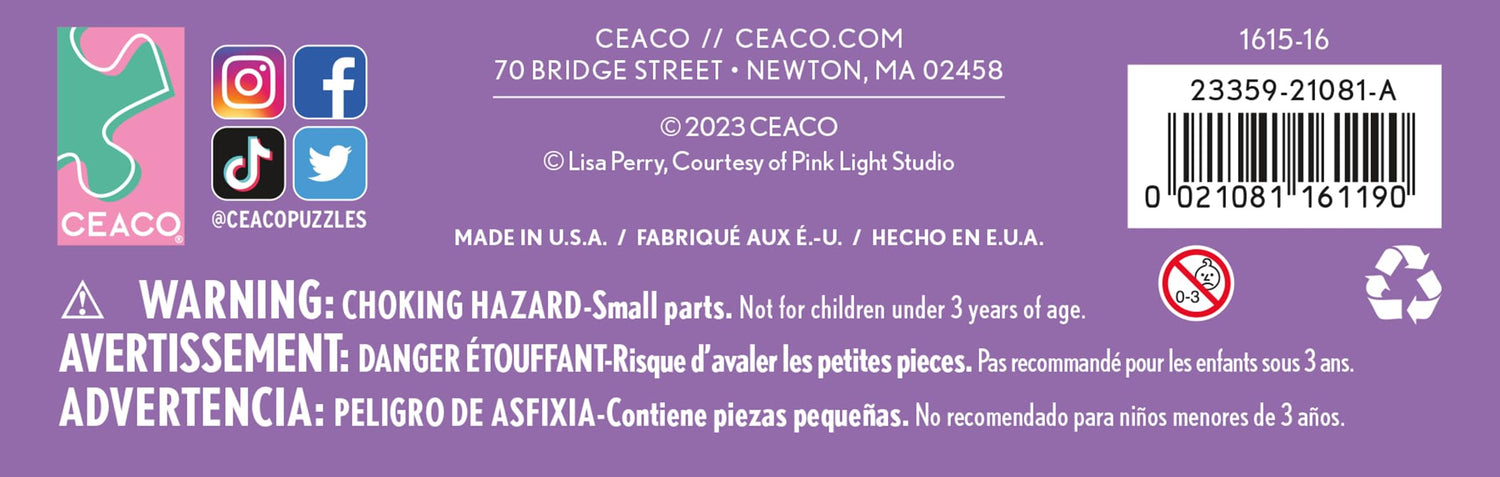 Details: Welcome to Ceaco! We are so grateful that you have found your “fit” here. Since our start in 1987 we have remained true to our mission: to create high quality, innovative and challenging jigsaw puzzles and to provide hours of family fun. We pride ourselves on developing and maintaining long standing relationships with some of the finest artists of our time. Our talented team of designers and marketing professionals are always searching the world over for developing trends, emerging artwork, and new technologies involving printing, die cutting, and unique puzzle materials. Our purpose is clear: to continue to be in the forefront of our industry and create a product that combines family entertainment with a distinctive aesthetic. Count on Ceaco for the most creative, exciting, and colorful products ever! Thanks and happy puzzling!