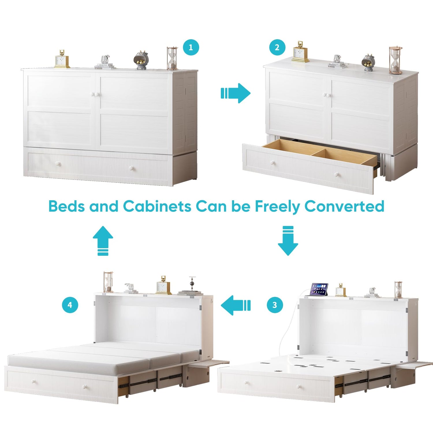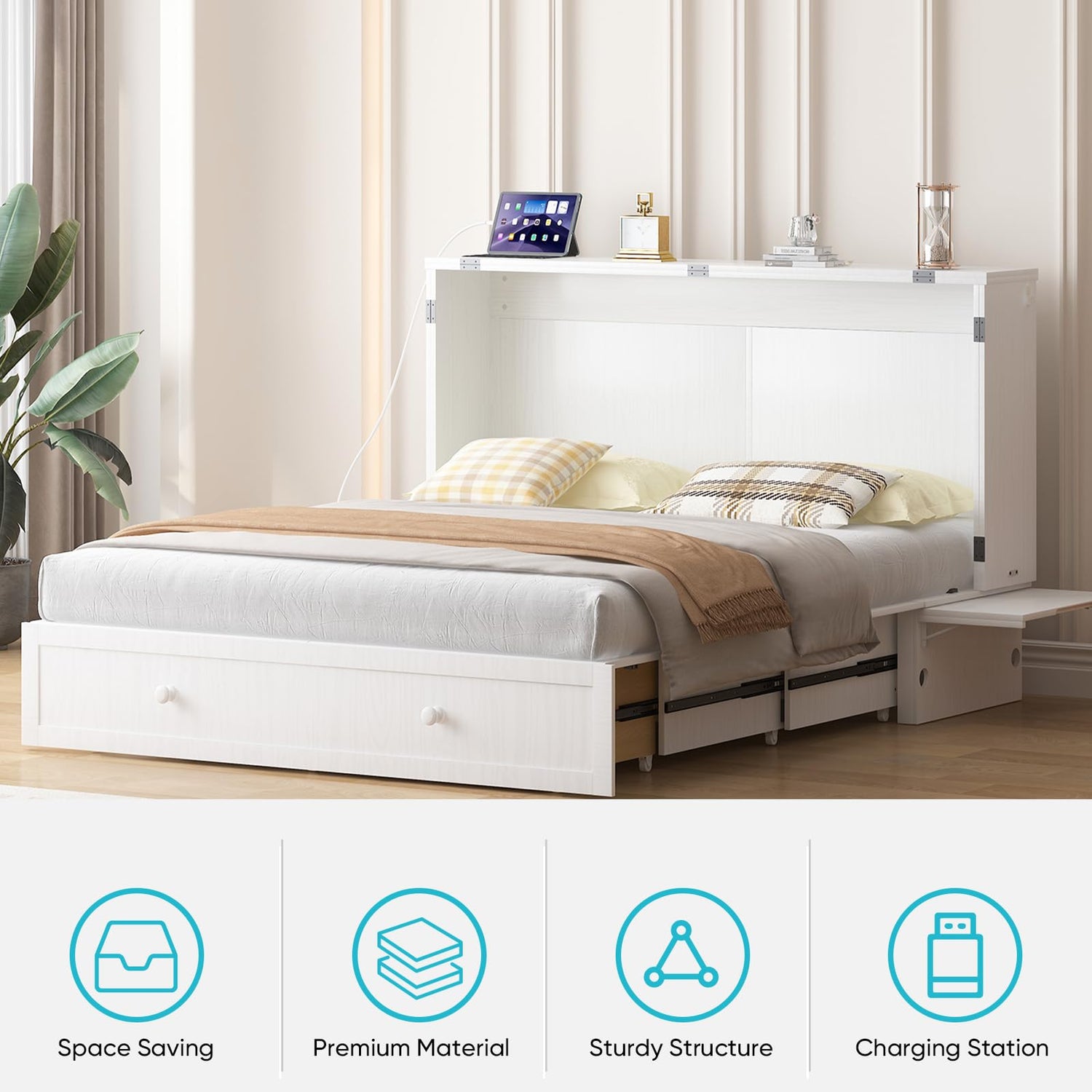 CECER Queen Size Solid Wood Murphy Bed with Memory Foam Mattress,Murphy Bed with Charging Station and Two Large Storage Drawers for Small Spaces/Bedroom/Guest Room(White)
