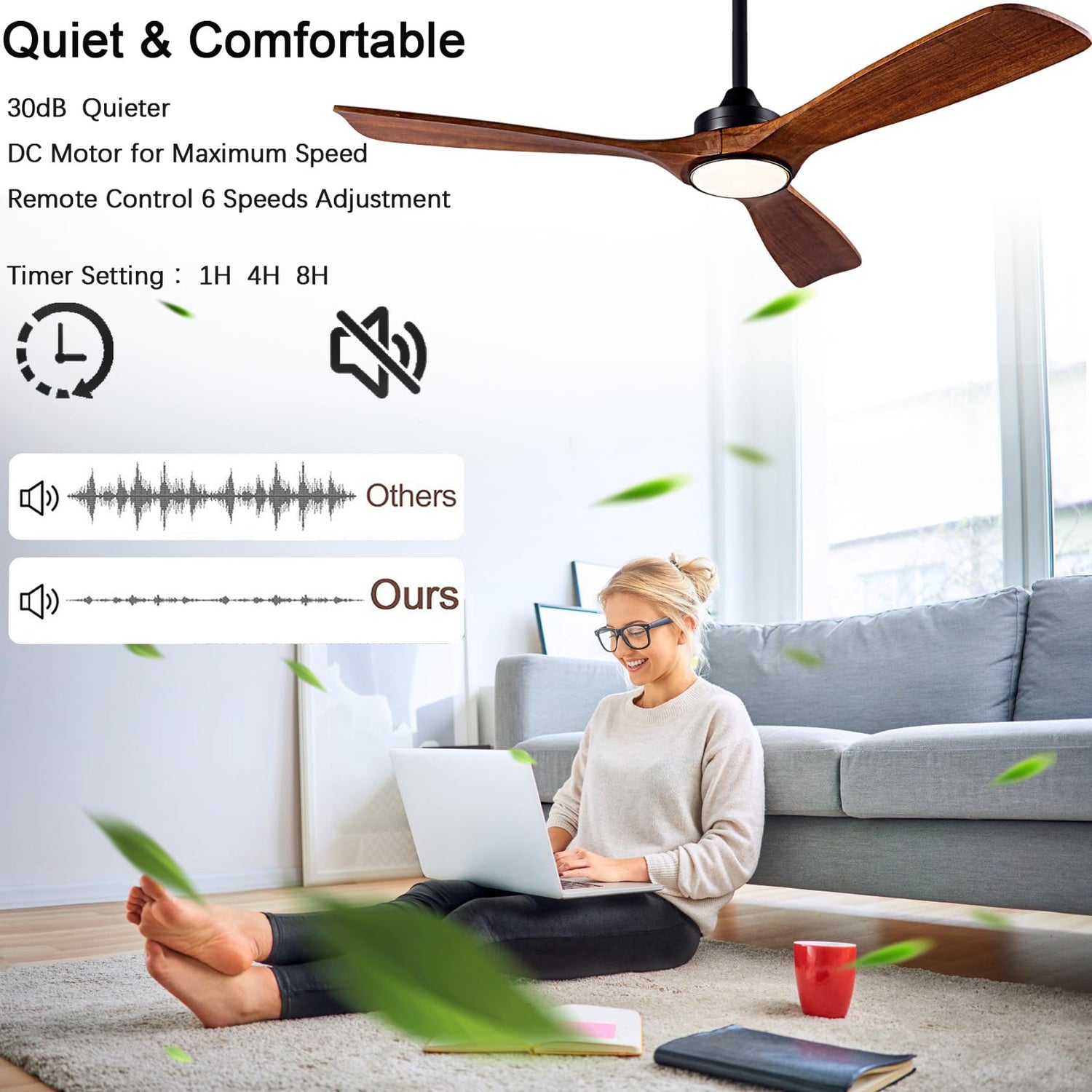 - 【Quiet Ceiling Fan With Memory Function】: 52-inch solid wood ceiling fan, low noise, maximum speed 185r/min, decibel less than 30DB, with memory function, suitable for use in the living room, study, farmhouse, etc., and can be mounted on the tilted ceiling with a tilt of 13 degrees.