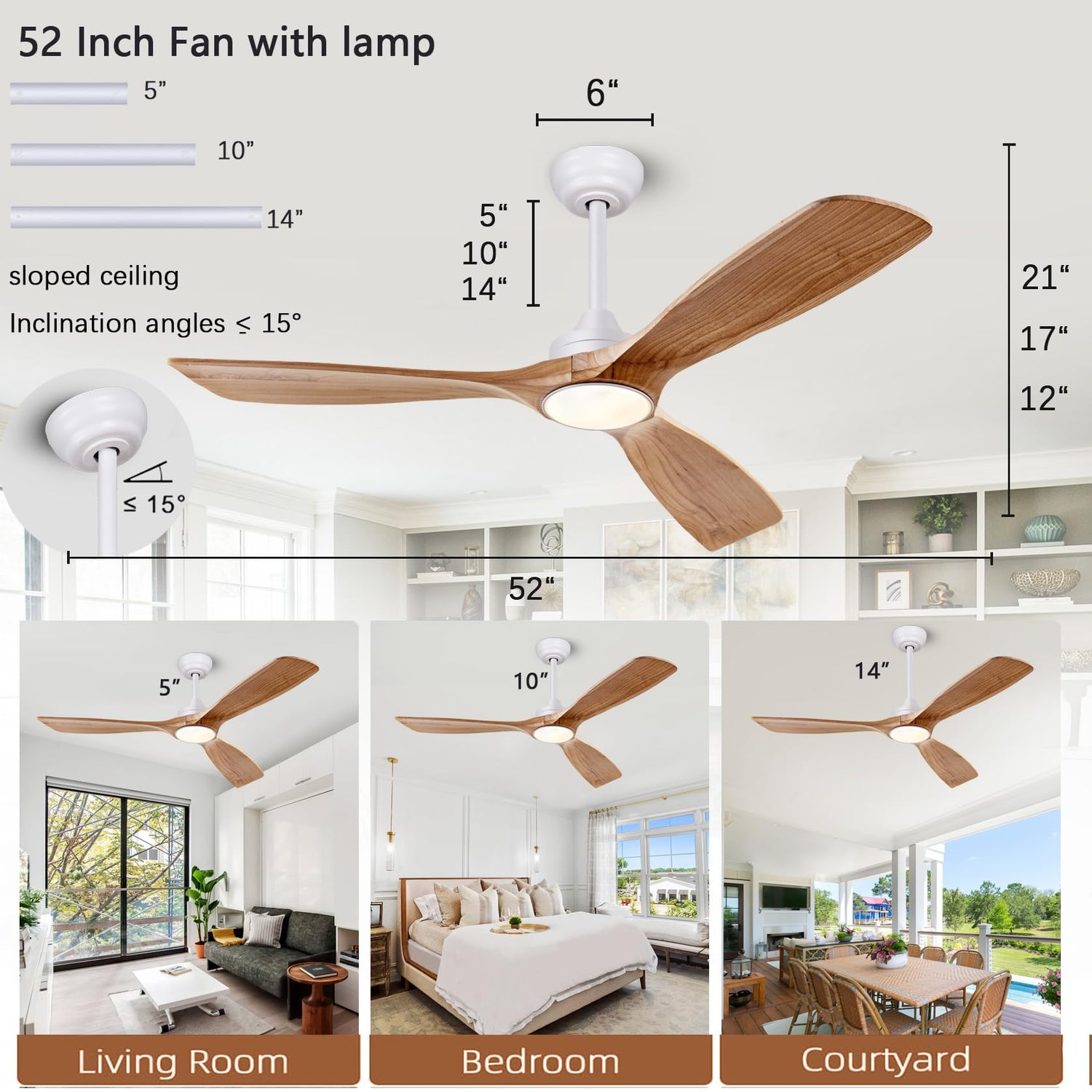 - Solid Wood Ceiling Fan:Ceiling fan light consists of three solid wood log color blades, the main body is pure white, with 3 extended hanging bars, respectively 5inch,10inch 14inch, installed from the ceiling to the ceiling fan at the very bottom of 12inch,17inch,21inch, may be free to choose the height of the installation according to the needs of the room, suitable for indoors, bedrooms, living rooms and corridors.