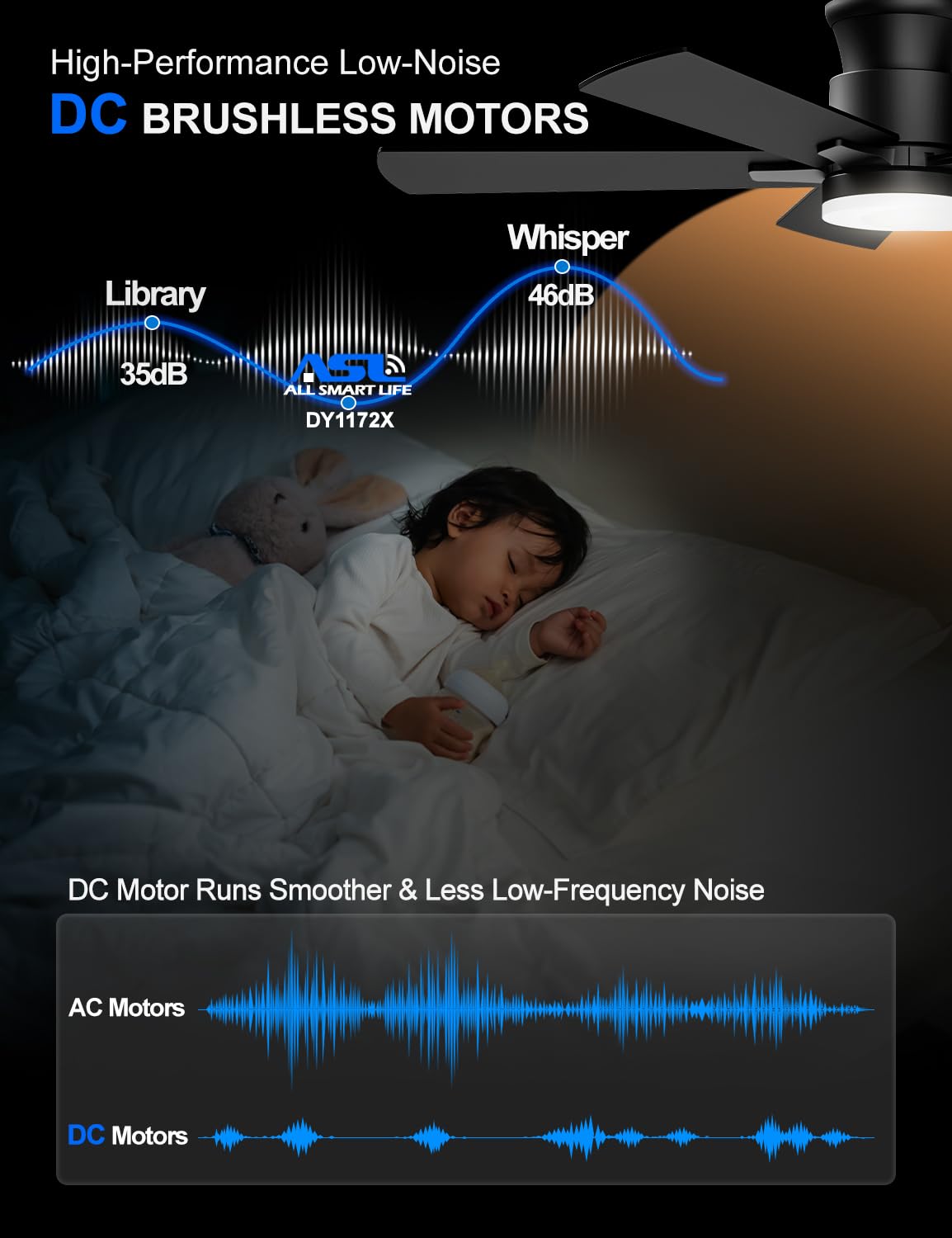 Designed for light sleepers, our ceiling fan features a pure copper brushless DC motor for silent operation. Enjoy minimal low-frequency noise levels, perfect for bedrooms or households with infants.