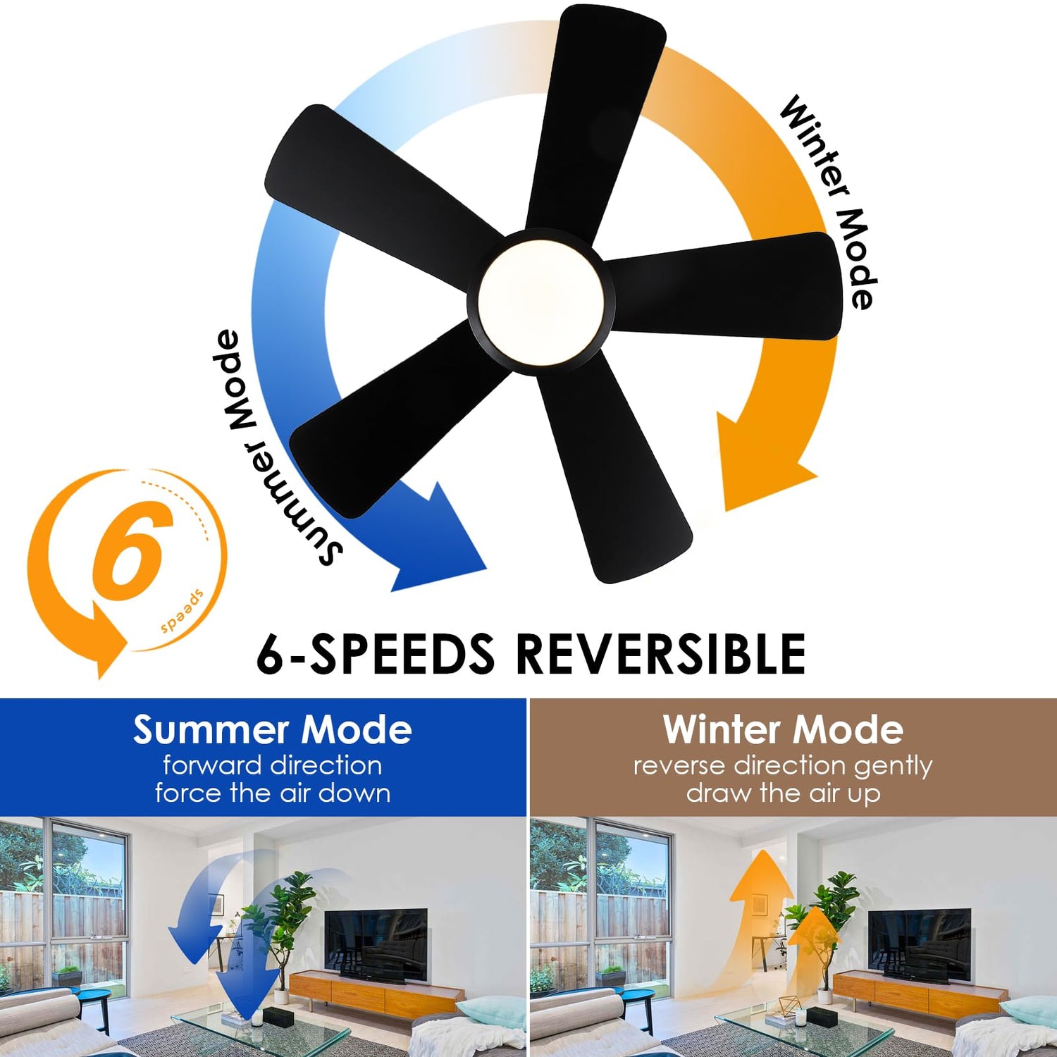 - ADJUSTABLE SPEEDS AND REVERSE ROTATION: 6 wind different fan speeds are available to suit your preferences and keep you comfortable all year round. The reversible rotation option allows for better air circulation to keep your room fresh and cool.