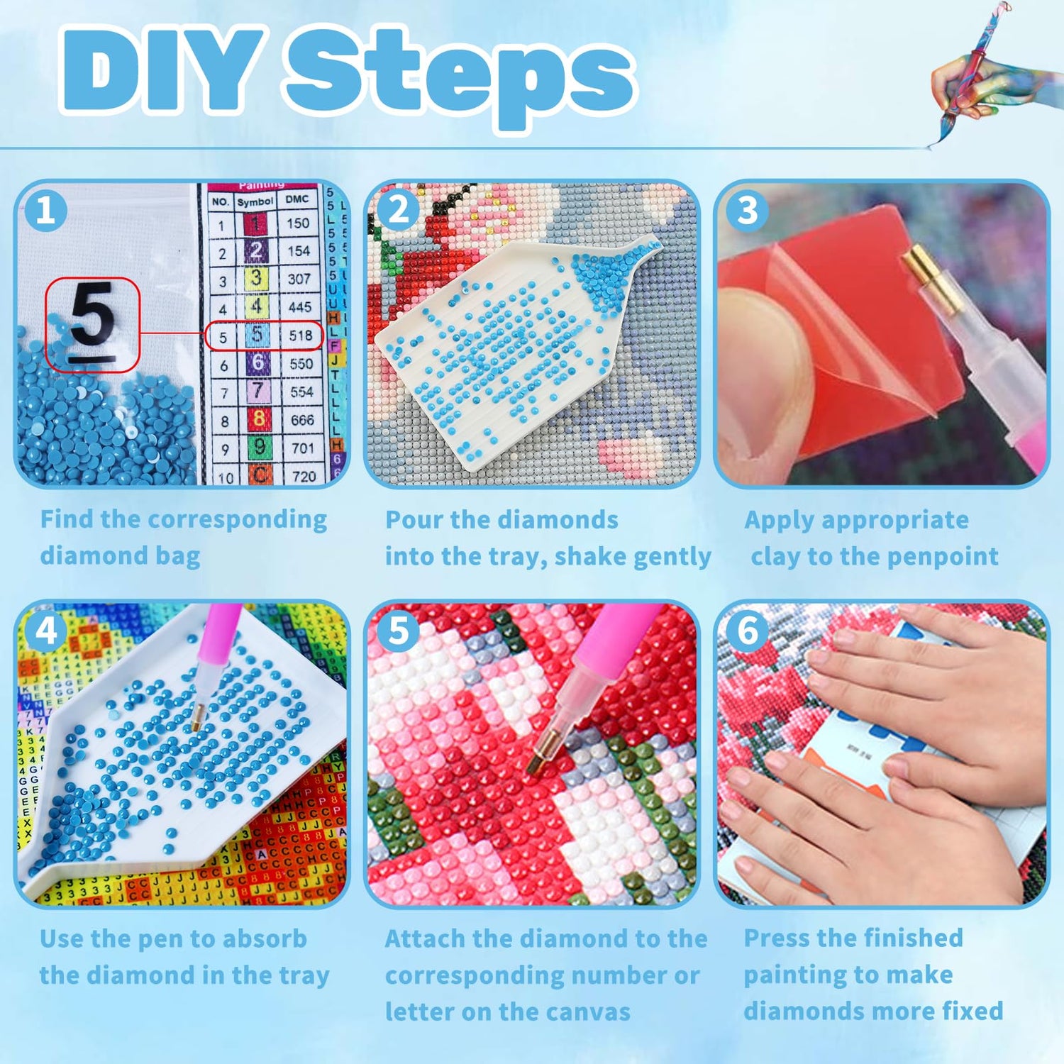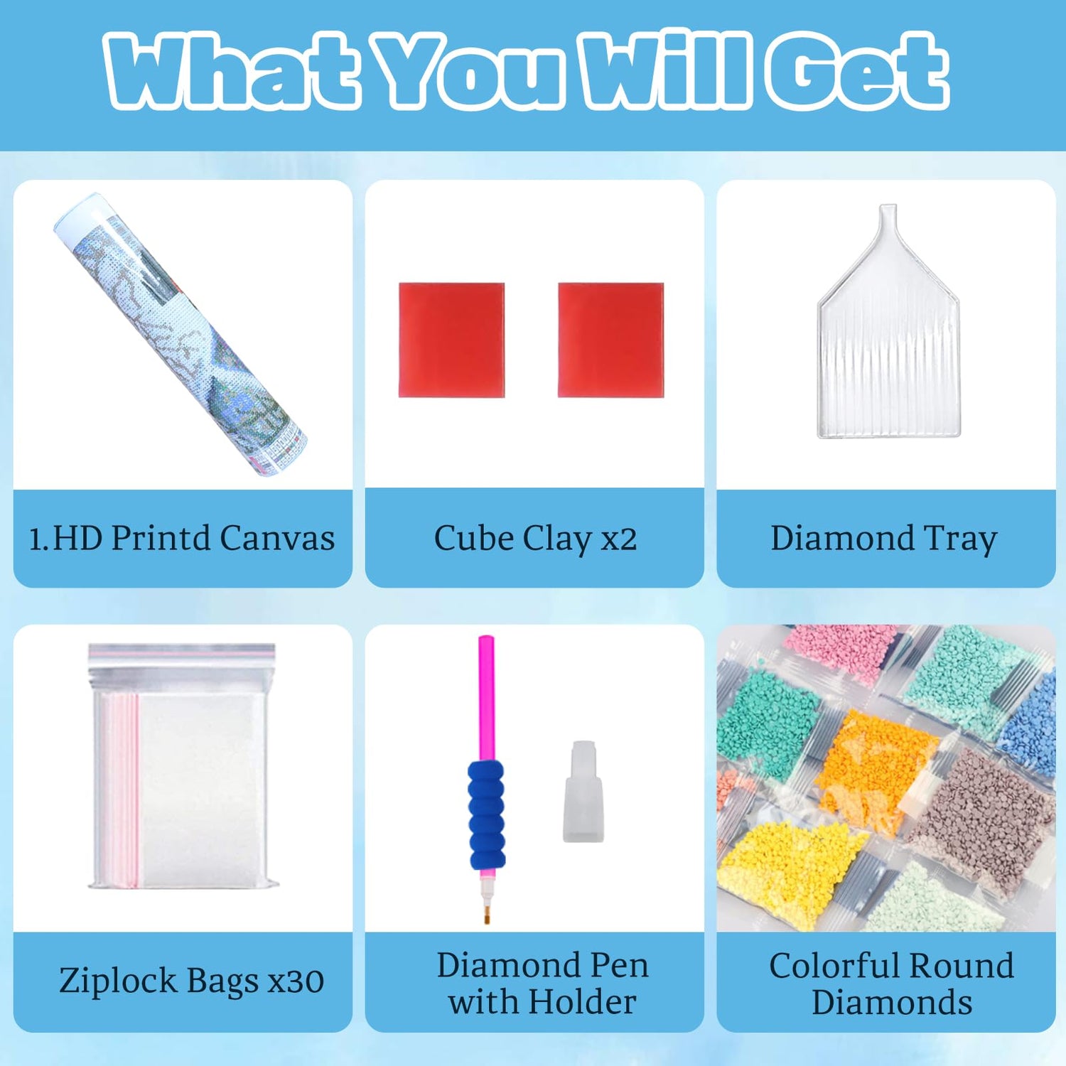 - 【What Will You Get】You will receive a diamond painting kit, which includes HD pre-printed canvas x1, diamond pen with 2 type of pen tips x1, glue clays x2, new design plastic tray x1, self-sealing bags x30 and Individually packaged colorful round diamonds for you to complete the art work (30% more diamonds)