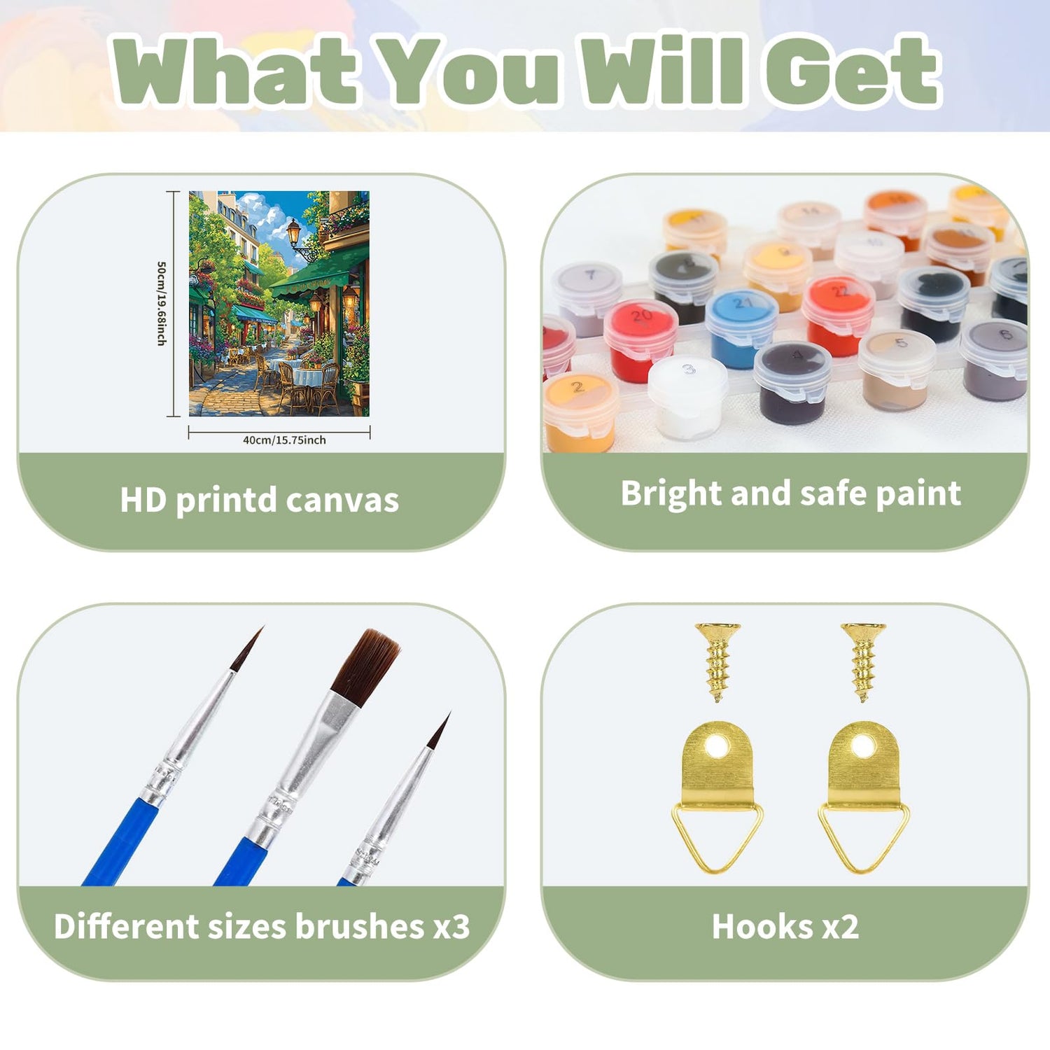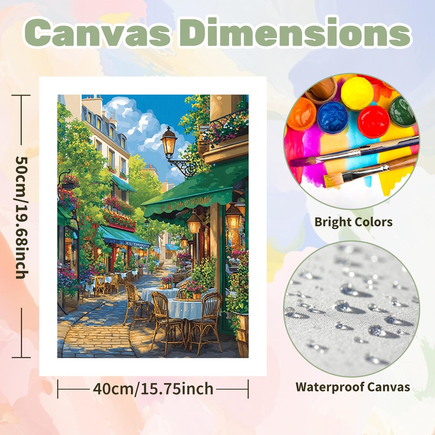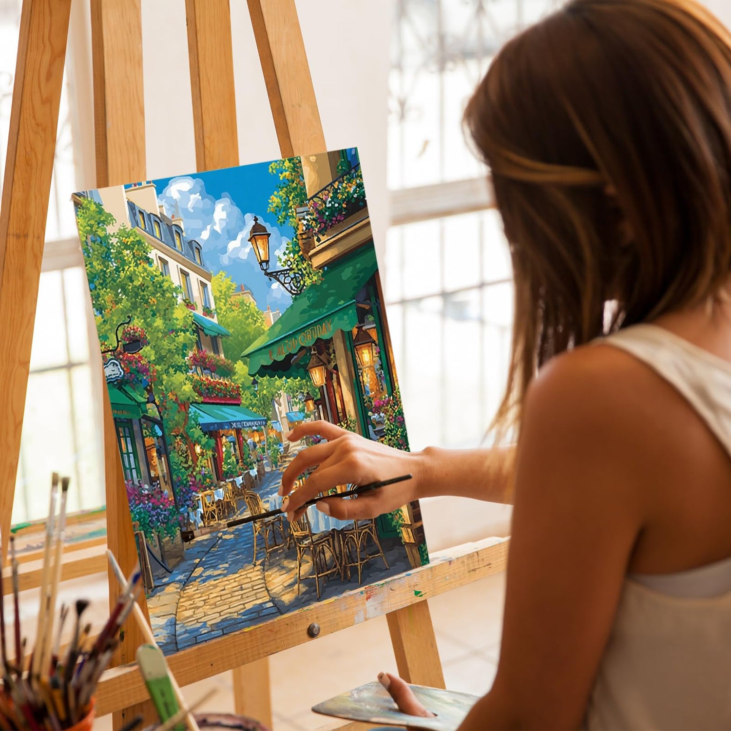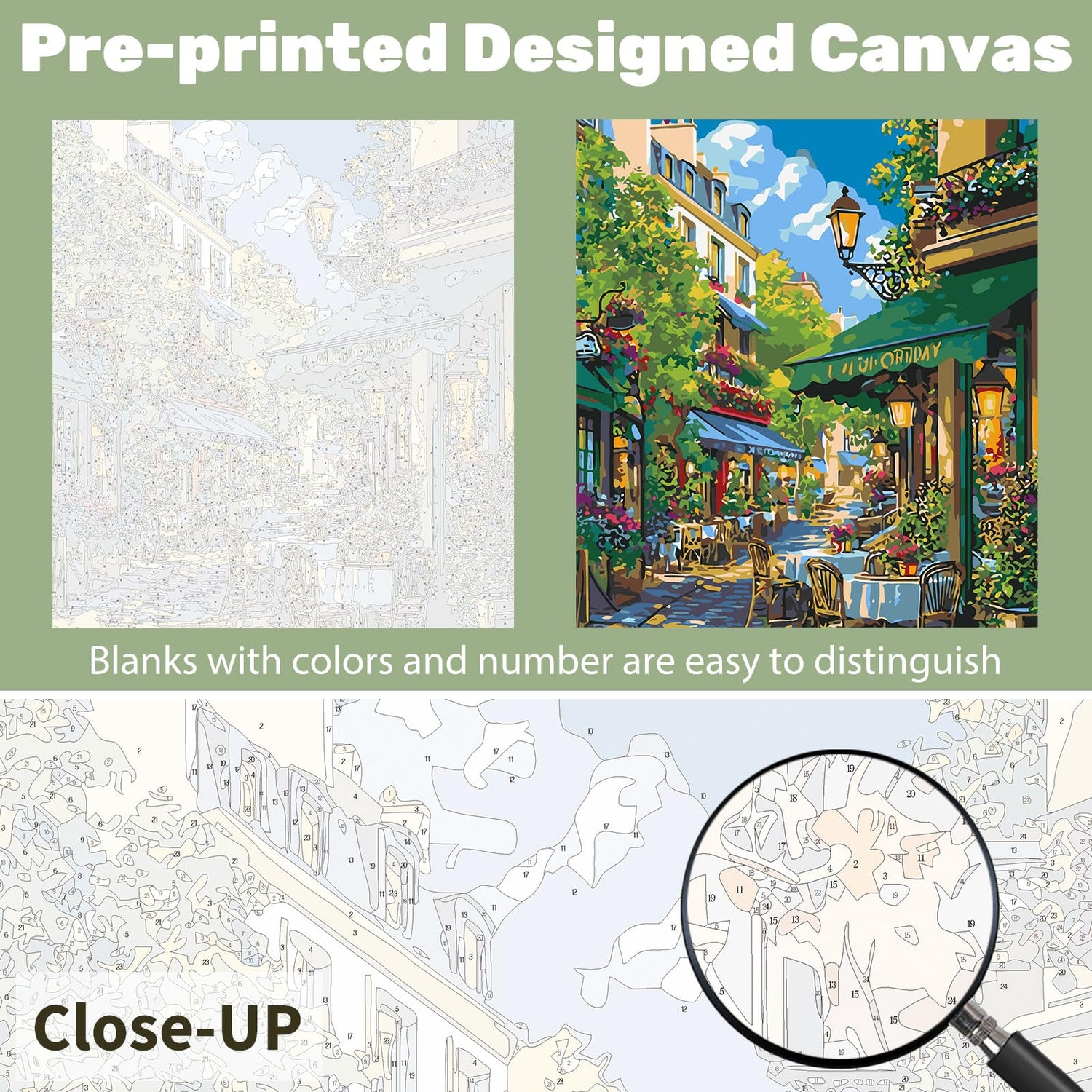 - 【High-quality materials】Our Street Cafe paint by number with kit uses high-quality acrylic paint to ensure bright and long-lasting colors that are not easy to fade. These durable materials allow your finished works to maintain their beauty and details, becoming precious works that you will treasure for many years and proudly display.