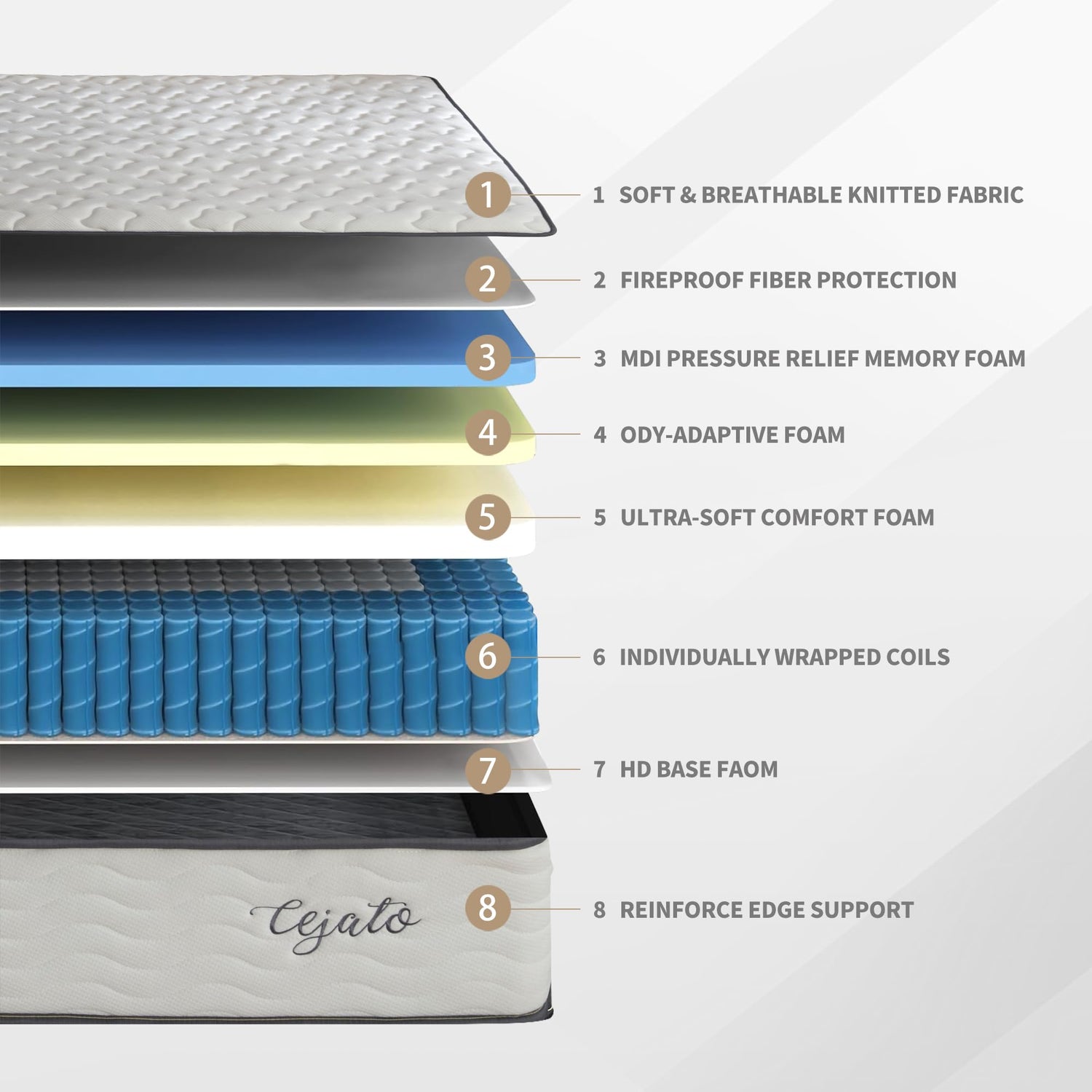 Cejato Full Mattress,Hybrid 10 Inch Full Size Mattress in a Box,Memory Foam & Individually Pocket Spring for Pain Relief,Medium Firm Full Mattresses
