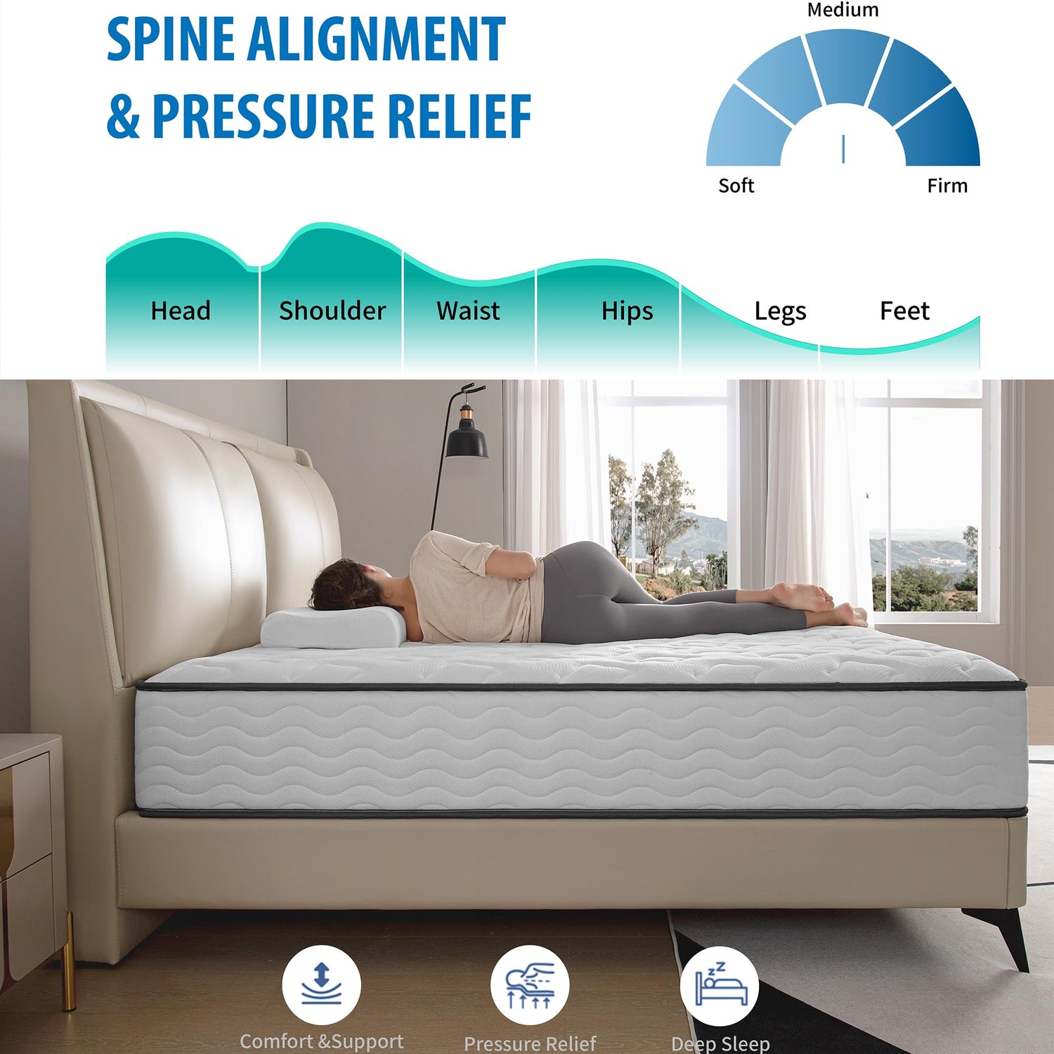 - Comfortable Support: This 10 inch queen mattress uses hundreds of individual pocket spring and gel memory foam unique combination, and to provide targeted support according to the body curve, which ensuring that your weight is evenly distributed from head to foot. This kind of ergonomics is very user-friendly and can relieve your physical fatigue, which allowing you to have a wonderful night.