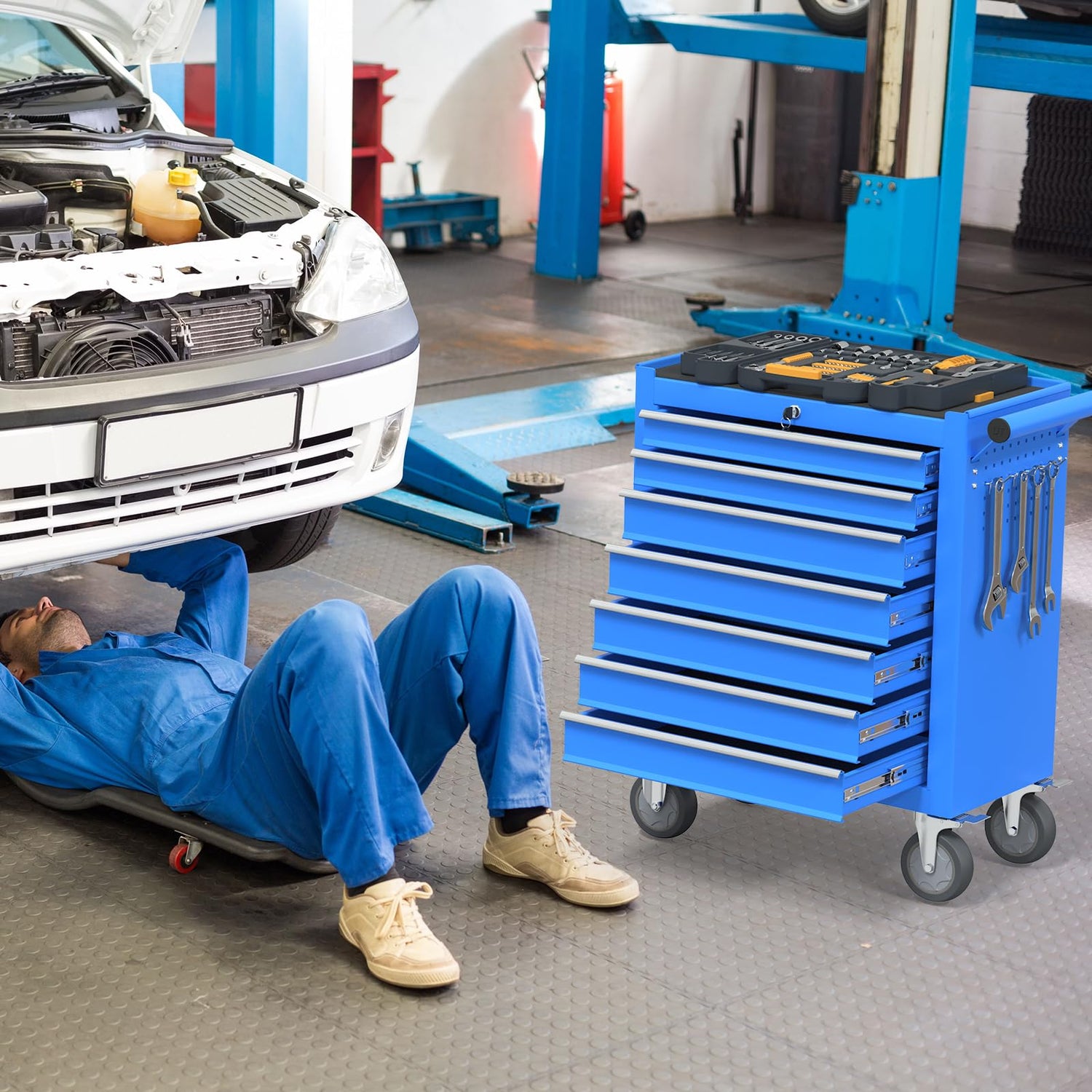 Cemostey 7 Drawers Tool Chest with Wheels, Metal Rolling Tool Box with Drawers, Large Capacity Tool Storage Cabinet with Keyed Locking, Tool Organizer Box for Garage, Workshop, Warehouse- Blue