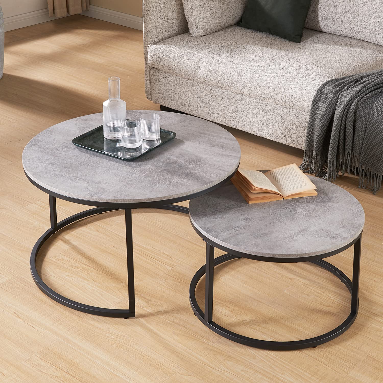 CENSI Round Nesting Coffee Table Set of 2, 31.5" Modern Industrial Center Tables for Living Room, Grey Marble Concrete Wood Finish with Black Metal Frame, Stacking Circle Accent Furniture