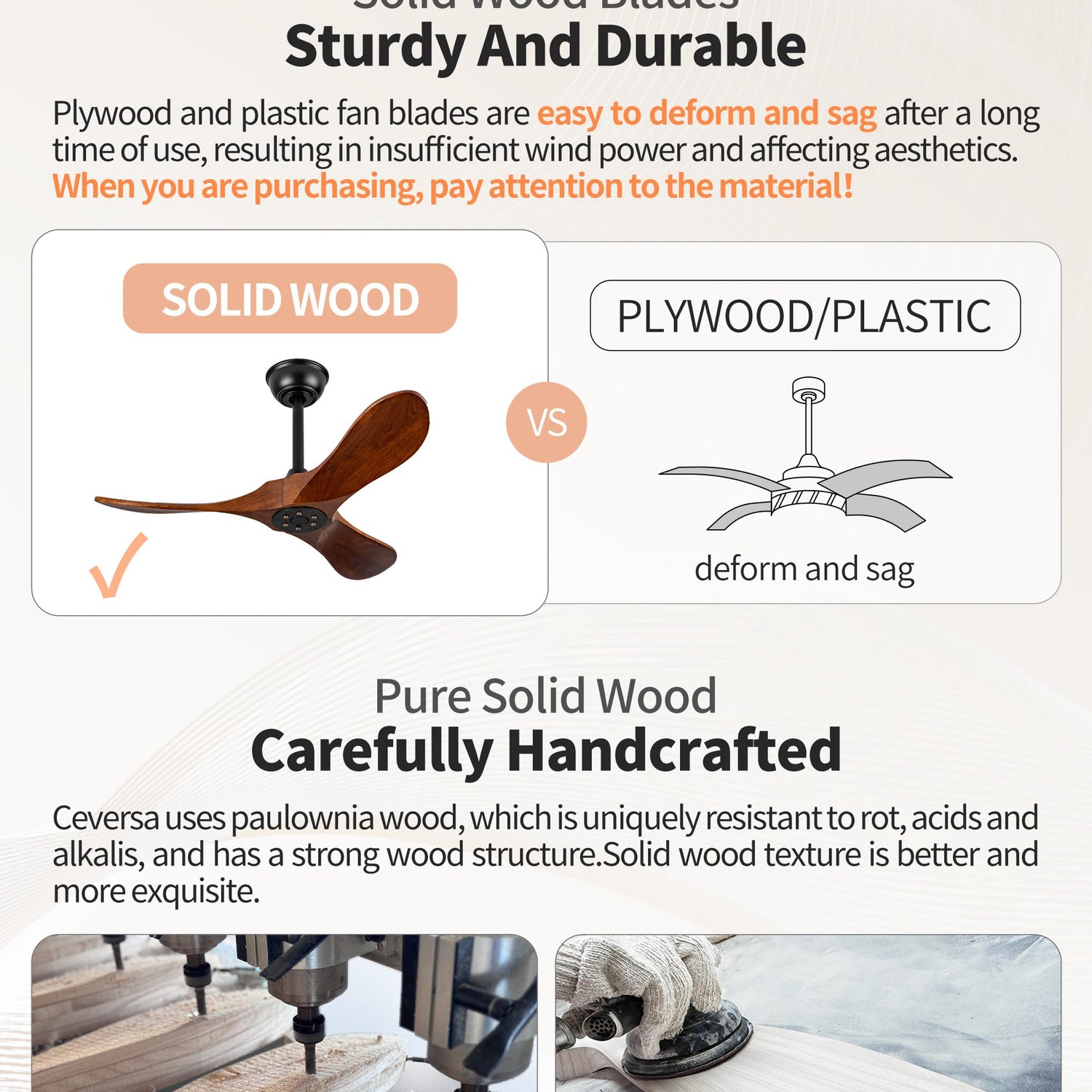 - 【Solid Wood Ceiling Fan Blades】Ceversa walnut ceiling fan no light are made of paulownia wood, which has been grown for over 20 years and is uniquely resistant to rot and acid and alkali corrosion, ensuring sturdiness. All Ceiling fan 3 blades are aerodynamically designed and professionally balanced to ensure stable rotation of the small ceiling fan without light.To protect the solid wood,ceiling fan should not be exposed to direct rain.