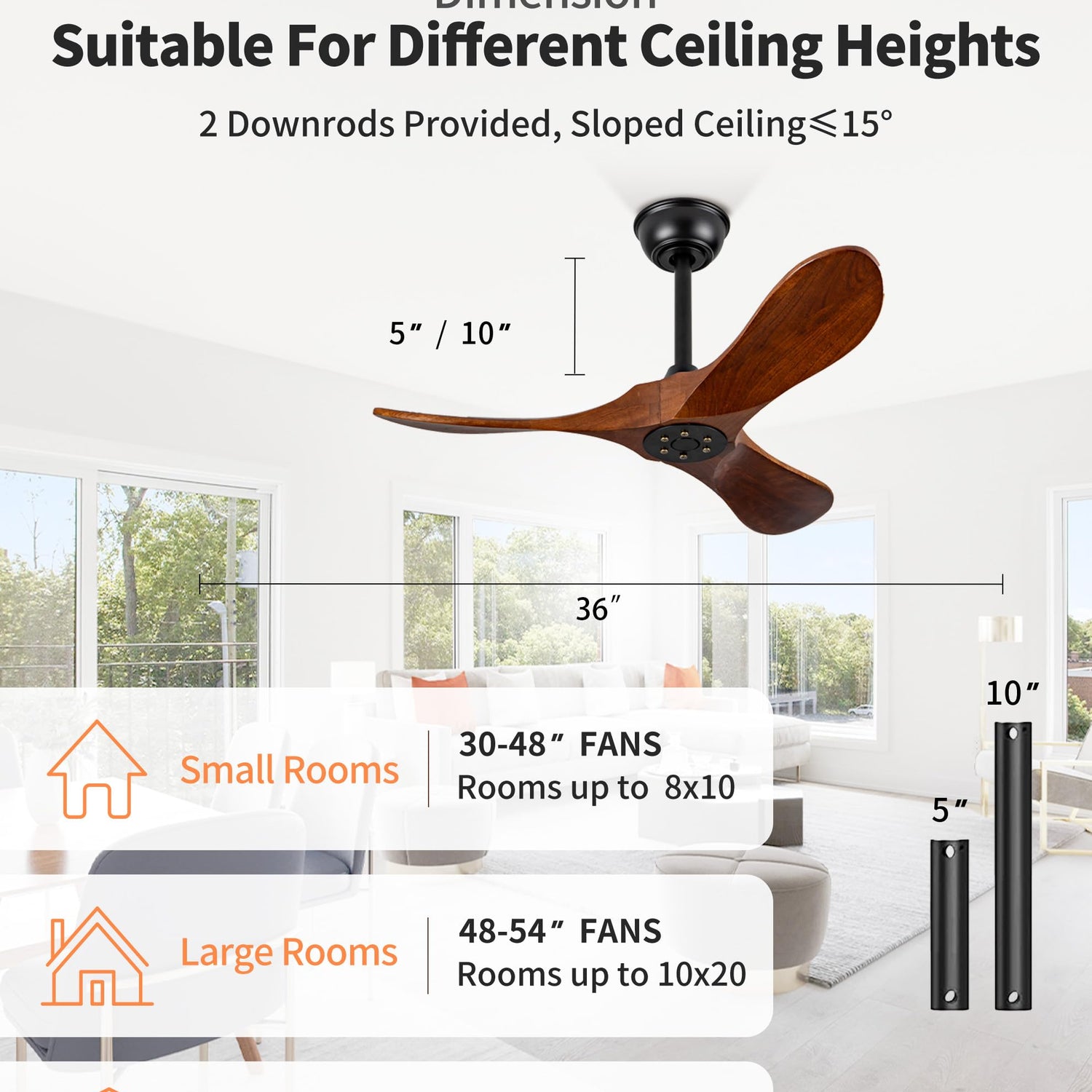 - 【Easy Installation】This outdoor ceiling fan comes with 2 downrods: 5" and 10", catering to various ceiling heights. Most components are pre-installed, and it includes a detailed instruction manual for effortless installation. This compact solid wood ceiling fan no light is suitable for bedrooms, living rooms, outdoor patios, cottages,porch, offices, dining areas, farmhouse,and more.Best installed when ceiling slope is within 10 degrees.