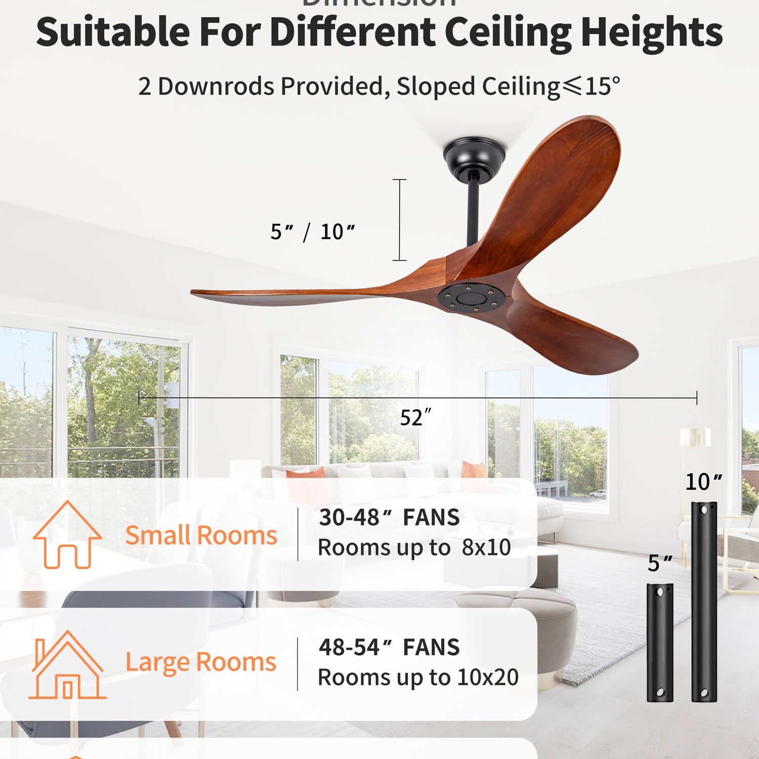 - 【Easy Installation】This farmhouse wood ceiling fan comes with 2 downrods: 5" and 10", catering to various ceiling heights. Most components are pre-installed, and it includes a detailed instruction manual for effortless installation. This compact solid wood fan is suitable for bedrooms, living rooms, outdoor patios, cottages, children's rooms, offices, dining areas, and more.