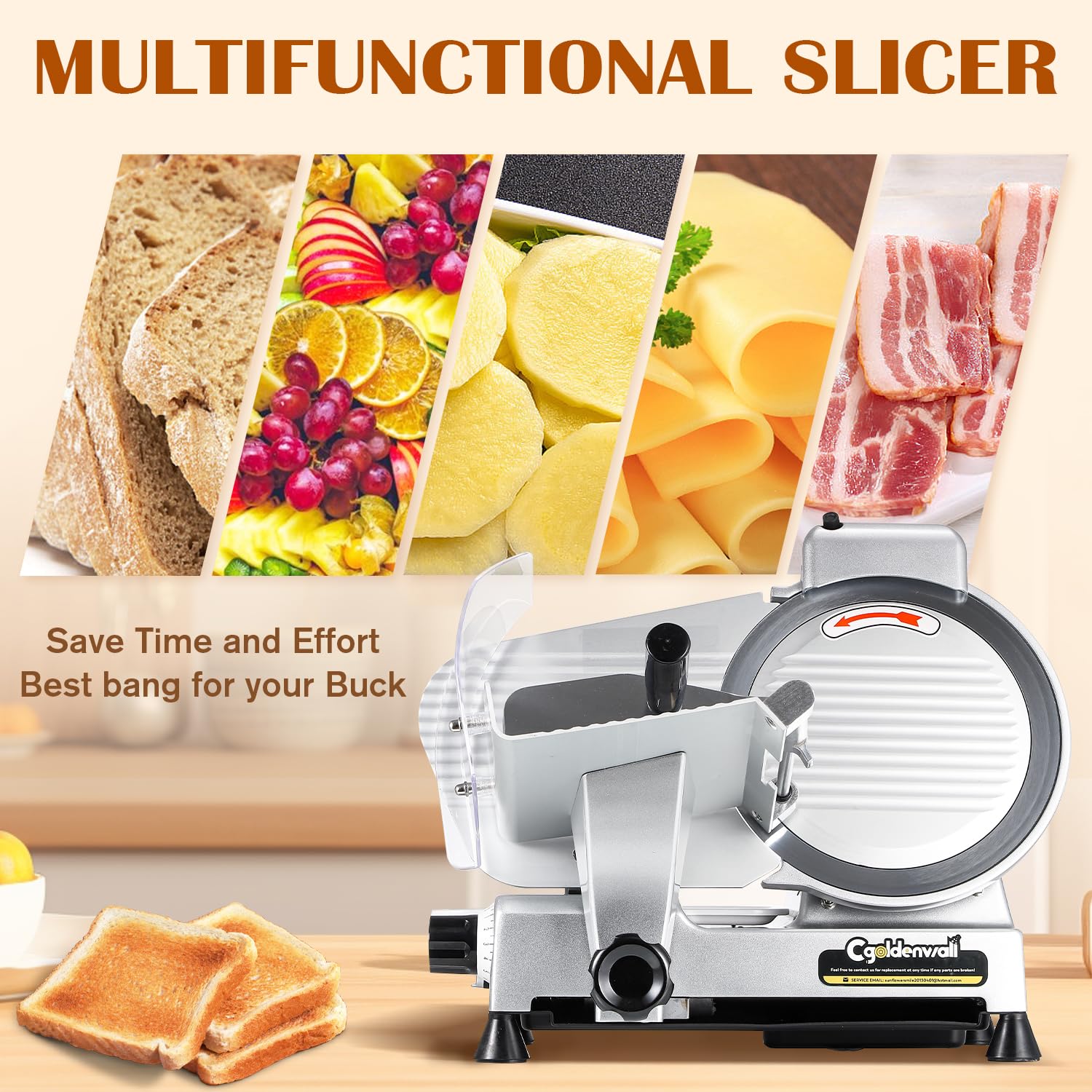 CGOLDENWALL Meat Slicer Machine 10" Commercial Meat Slicer 240W Electric Deli Meat Cheese Food Slicer 0-1/2" Adjustable Thickness Semi-Auto Frozen Meat Slicer for Home, Copper Motor Low Noise Durable