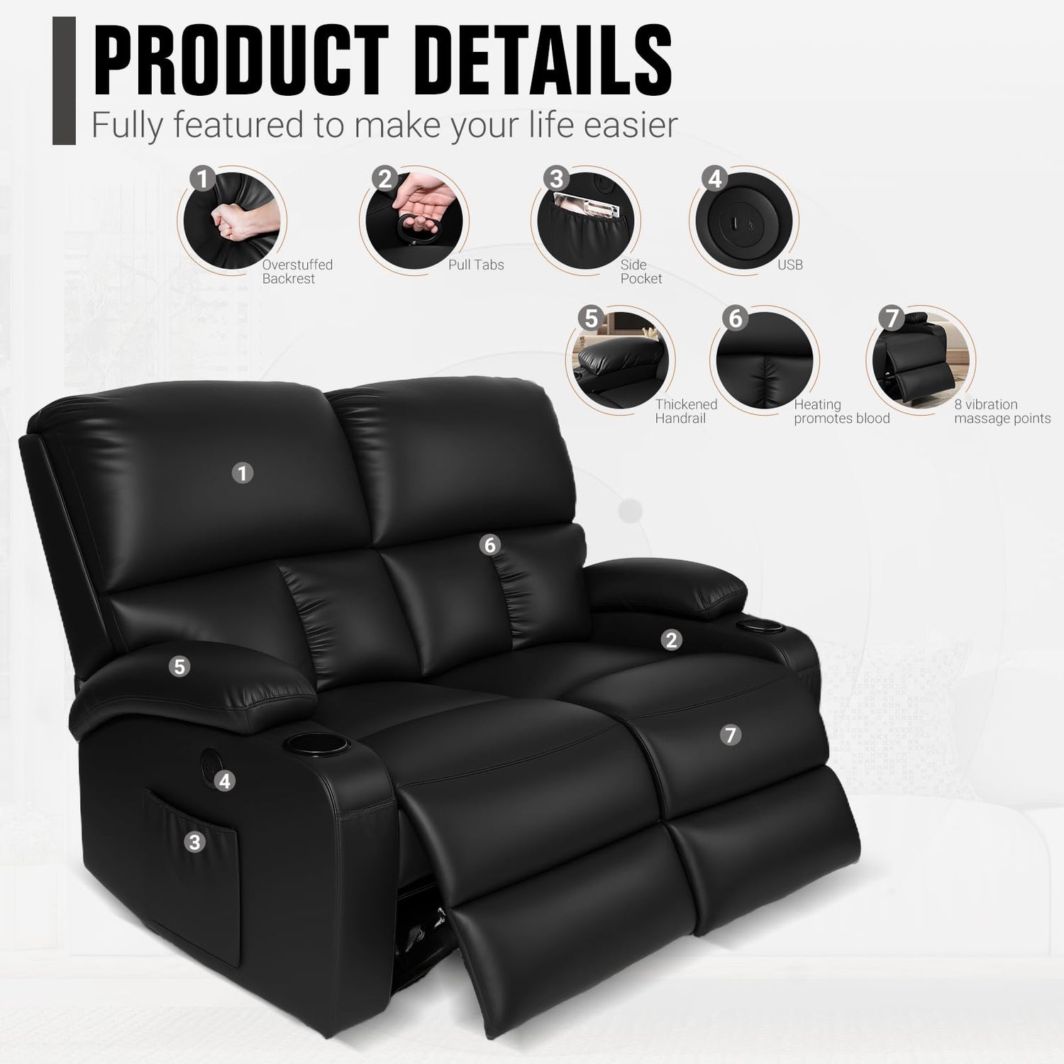 - Massage and Heating: This leather loveseat has features 8 vibration massage points located in the back, lumbar, thighs, and legs, which can be controlled via remote for customized intensity to meet your unique massage needs. Rocking chair adding lumbar heating promotes blood circulation, effectively reducing fatigue and stress and enhancing your overall relaxation experience. Heat works with massage making it perfect for unwinding after a long day.