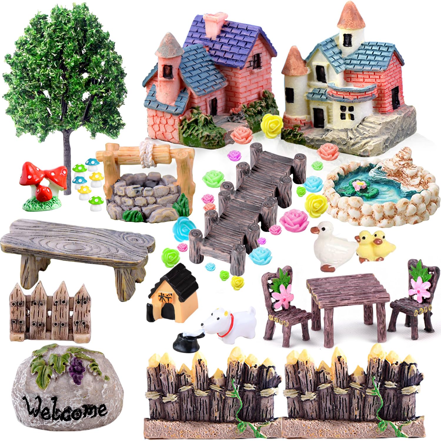 - Set Contents- You will receive 48 pieces miniature garden accessories in the package, including 2pcs pretty small house,1 set miniature tables and chairs(one table and two chairs), 1pcs welcome stone statue,1pcs bench, 1pcs Christmas tree, 2pcs tree stump fences, set of 3pcs duck decor, set of 3pcs dog decor, 1pcs well,1ps pool, 2pcs vintage wooden bridge, 1pcs red mushroom bushes, 6pcs mushrooms(random color), 21pcs flowers in 2 size (random color)