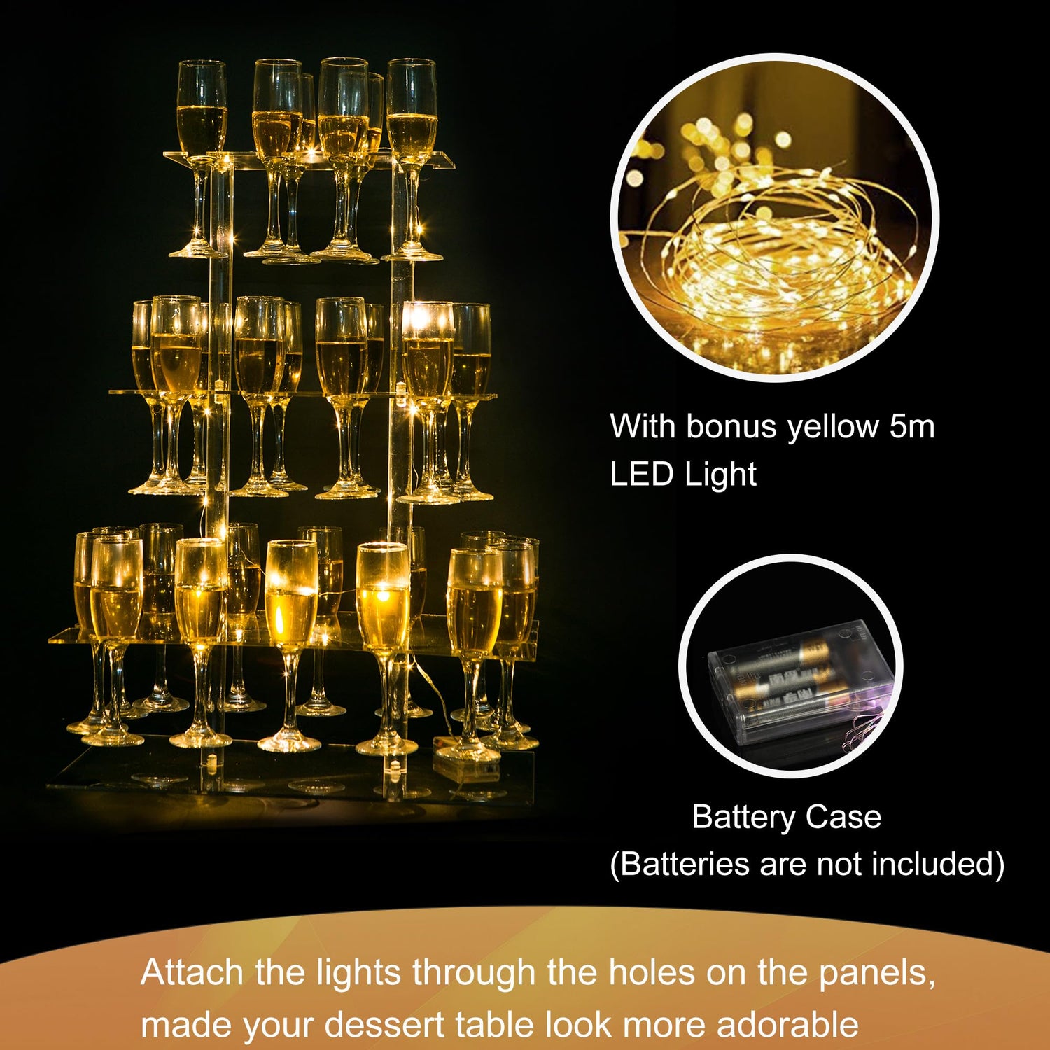 - Widely Application: Enhance your party atmosphere with these stylish and modern acrylic champagne tower stand. Suitable for various gathering, effectively utilized in birthday party, wedding, engagement, festivals, celebrations, commercial event. We provide an additional 5-meter long light string to bring more happiness and satisfaction to your family and friends