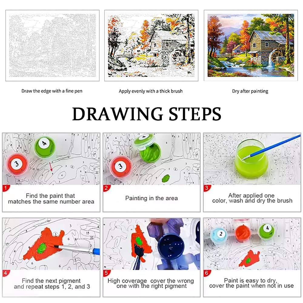 - Healthy Materials: Adult paint by number kits is acrylic, which can be directly colored without the need for water blending. If you accidentally use the wrong color, cover it with the correct paint. Acrylic paint dries quickly, you can add one or two drops of water to prevent it. After use, be sure to cover it and keep the paint moist.