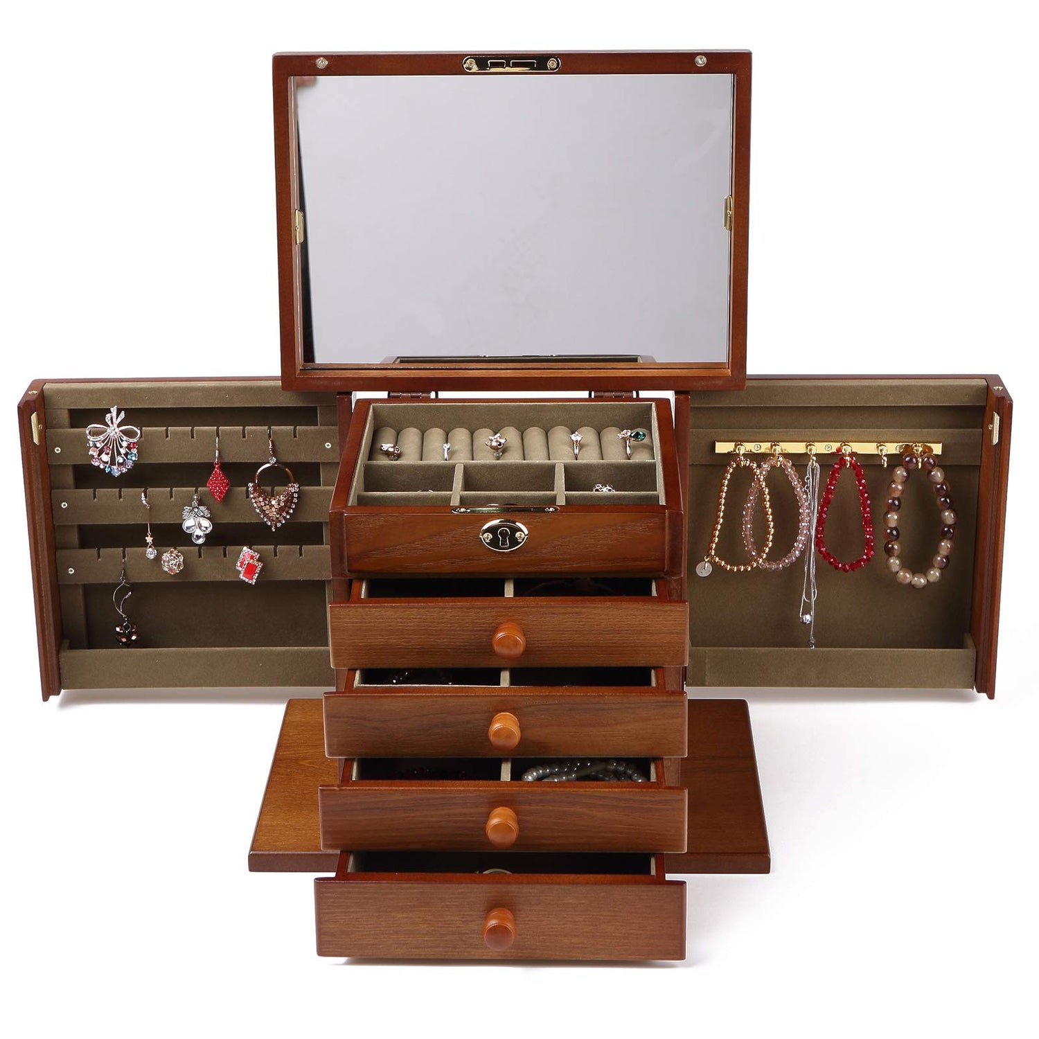 This is a 5-tier jewelry box made of solid wood and MDF. It contains 4 drawers, 2 side doors and a built-in mirror on the top, spacious for your necklaces, bracelets, earrings, rings and other jewelry accessories.