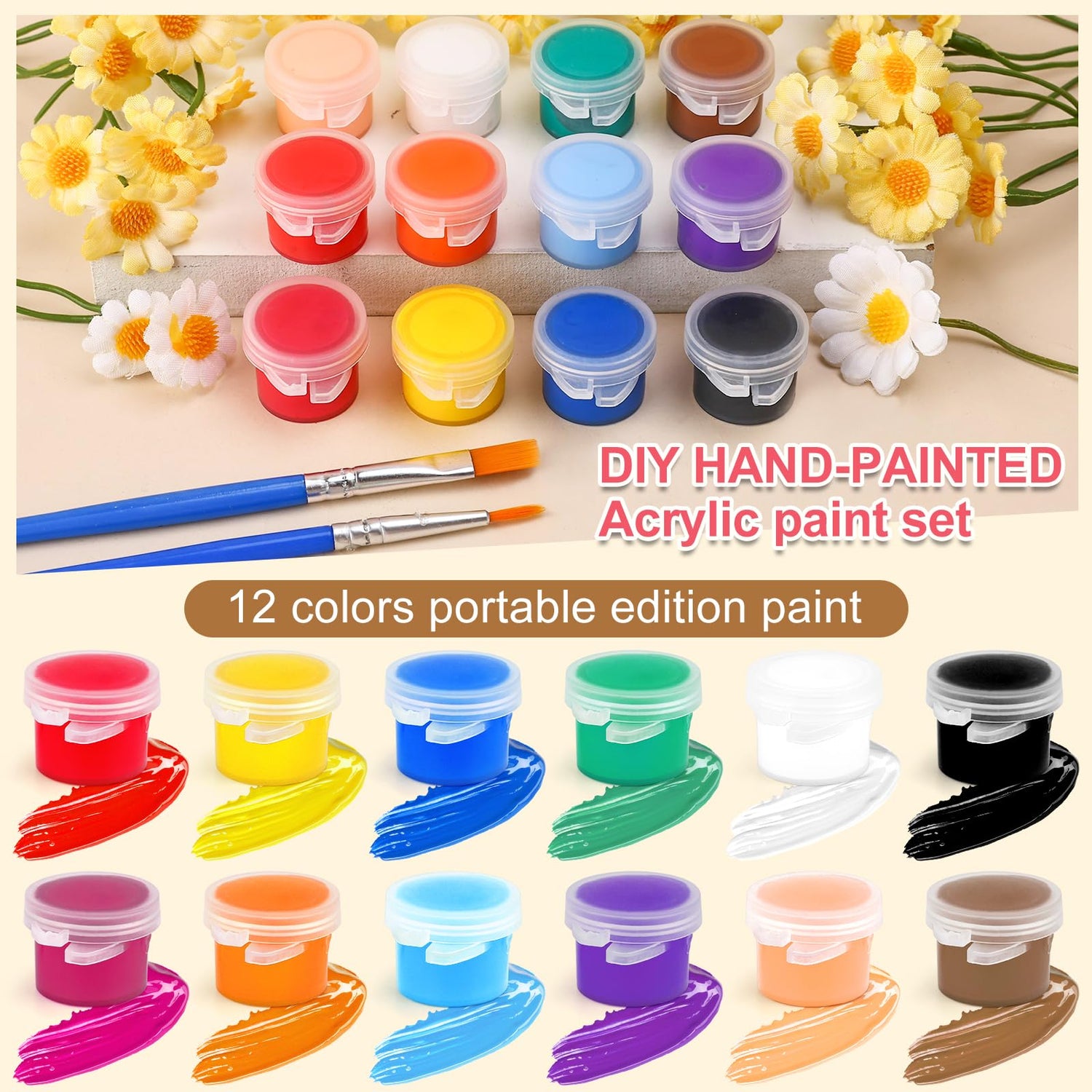 - 【Packing List】: the package contains 23 sets of watercolor acrylic paint in 12 colors, 23 pointed brushes, and 23 flat brushes;The vibrant colors can meet the different needs of painting and coloring. Perfect for teachers, art students, amateurs or anyone who enjoy painting.