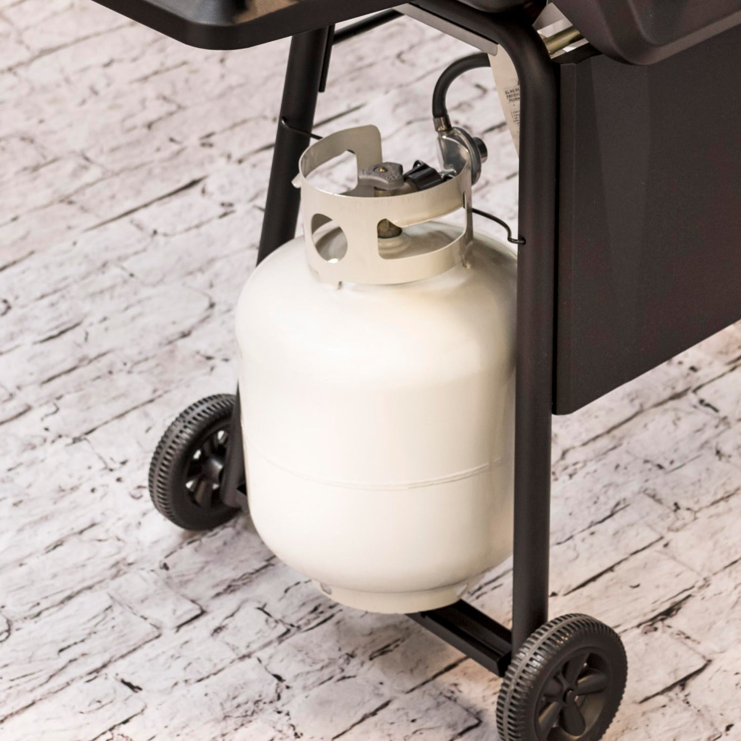 - GAS GRILL: Powered by liquid propane gas, this grill runs on a 20-pound tank, not included. It reaches cooking temperatures quickly, delivers high temps and maintains even heat.