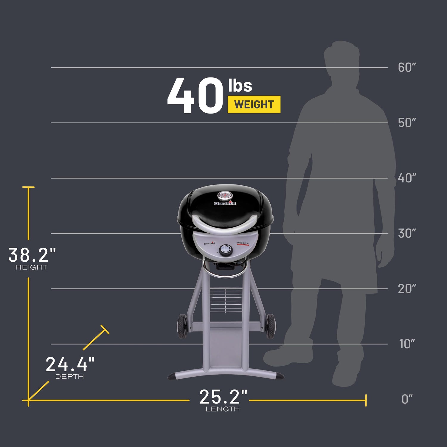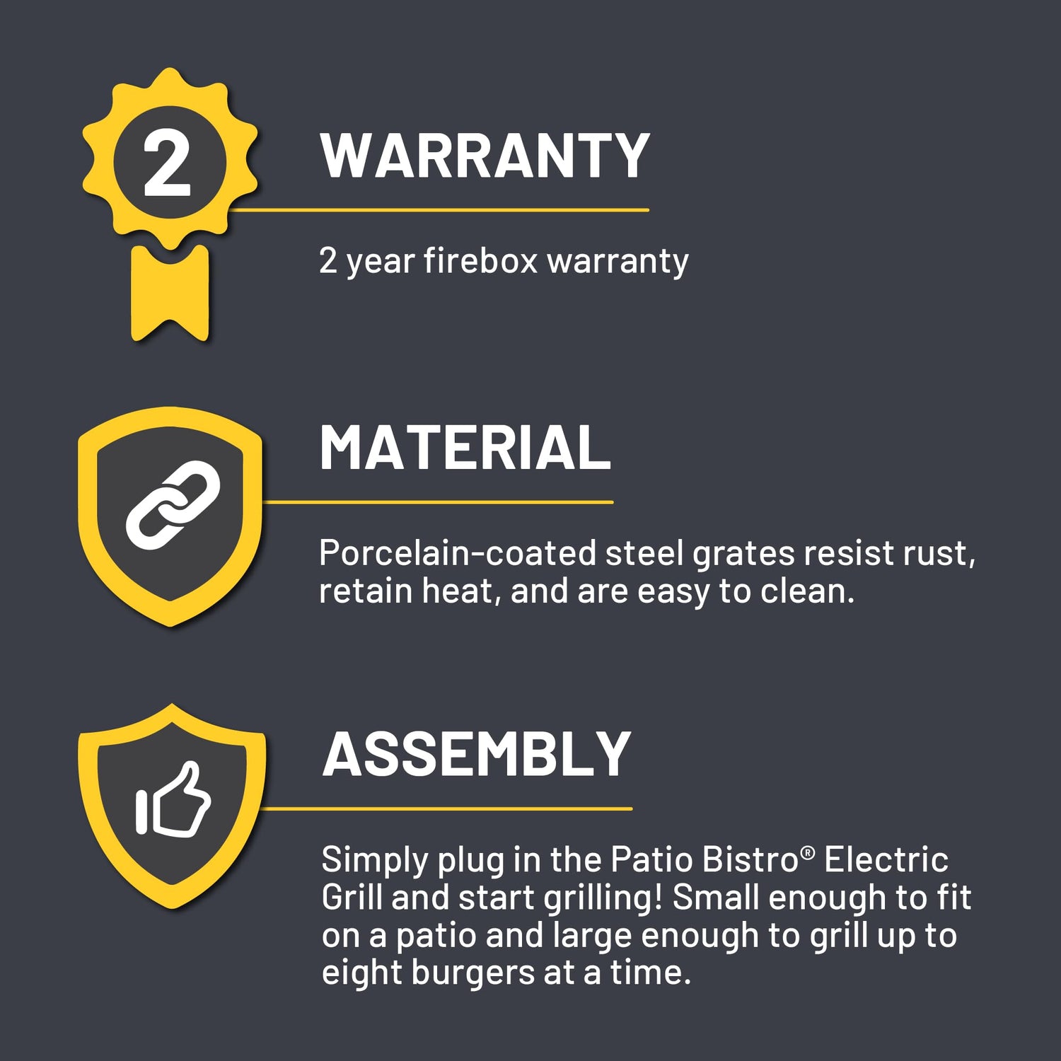 Details: Plug in the Char-Broil® Patio Bistro® TRU-Infrared™ Electric Grill and start grilling without the hassle of gas or charcoal. Small enough to fit on your patio, this little grill is still big enough to grill up to 12 burgers. In fact, you can grill everything from steak to vegetables and dessert on the Patio Bistro. Invite your friends and family for dinner with the confidence that your food will be tender, juicy and delicious every time. If you want delicious grilled flavor without the hassle of gas or charcoal, you want the Patio Bistro TRU-Infrared Electric Grill.