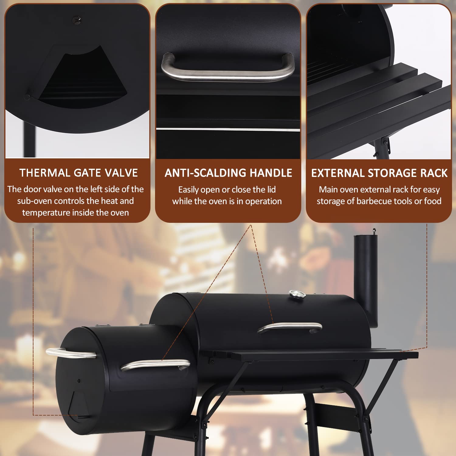 - 【Temperature Monitor&Ample space】The offerset smoker features with Lid-Mounted thermometer gauge helps you monitor the temperature while cooking.The external shelf for easy storage of BBQ tools or seasoning