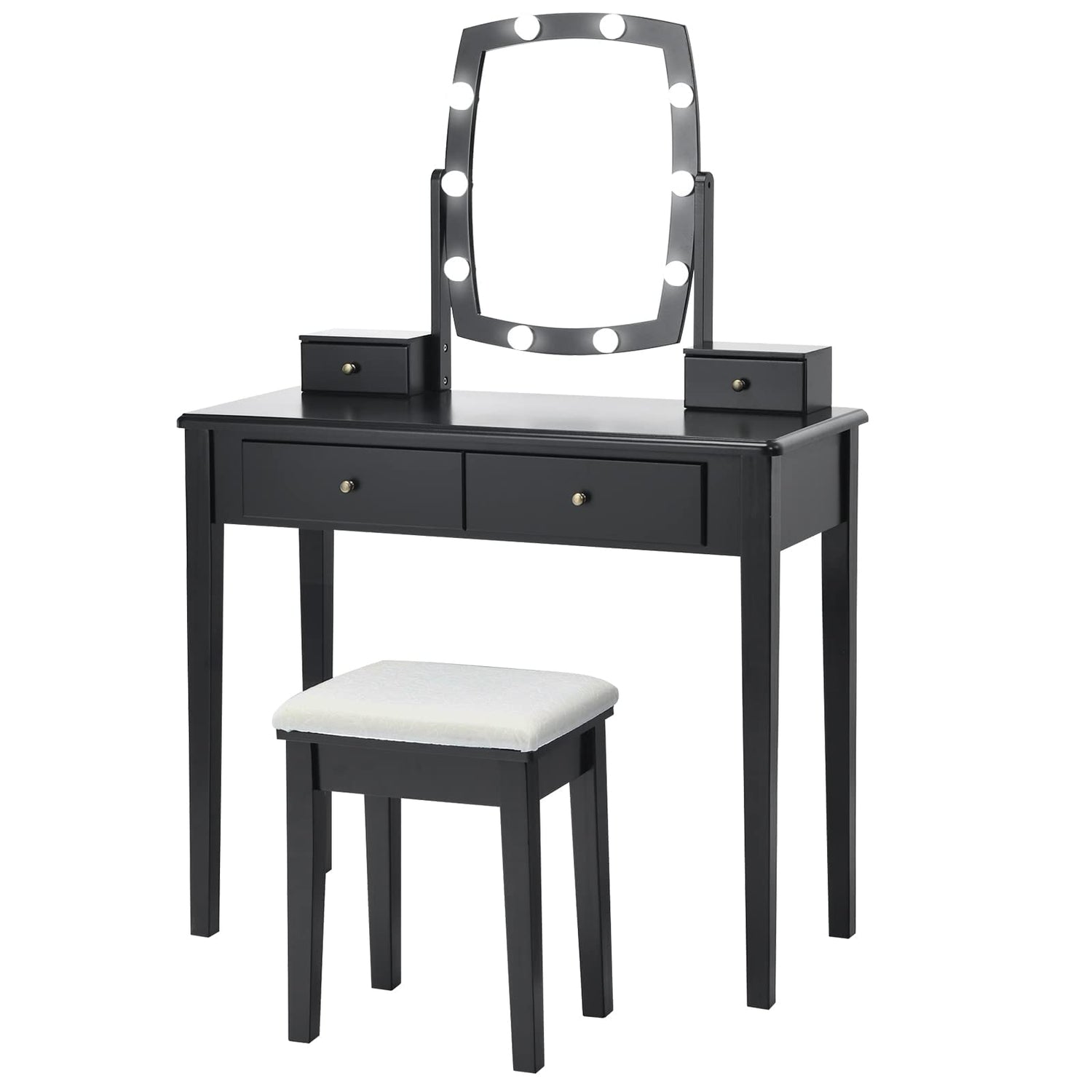 CHARMAID Vanity Table Set with Lighted Mirror, 10 LED Bulbs Adjustable Brightness, 4 Drawers 2 Dividers, Modern Bedroom Makeup Desk Dressing Table with Cushioned Stool for Girls Women (Black)