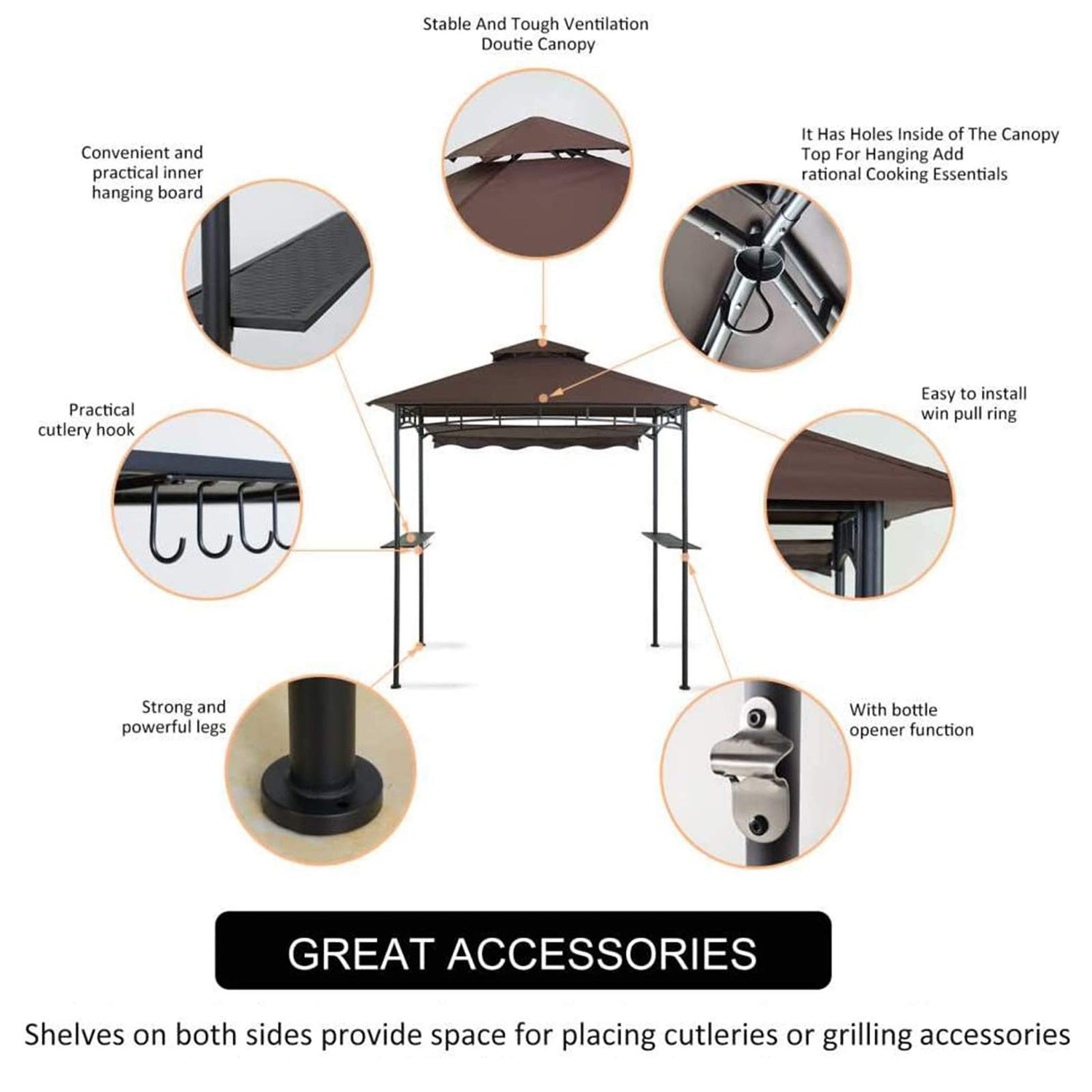 - Great accessories, ideal outdoor grill canopy:2 hanging boards provide space for grilling accessories, hooks help hang cooking essentials, we recommend using sandbags to ensure stability in windy conditions