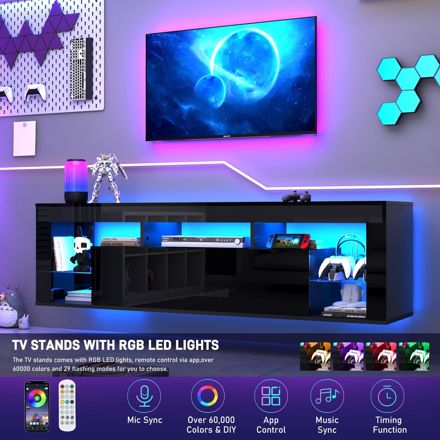 - Smart LED Light Strip: The floating media console is equipped with colorful LED light strips, which can control multiple RGB lighting effects through APP and remote control, support music rhythm and timed switch function, and create an immersive light and shadow experience and gaming experience.