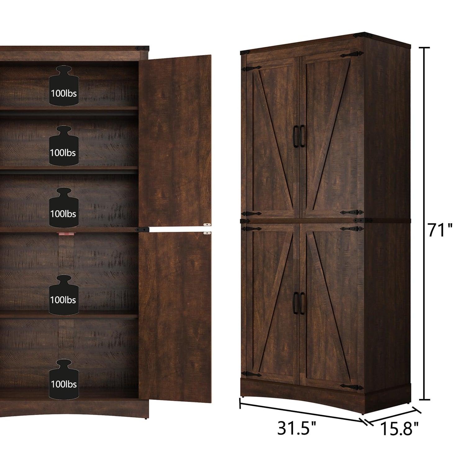 chartustriable 71in Farmhouse Kitchen Pantry Cabinet,Tall Storage Cabinet with 4 Doors and Adjustable shelves,with Load-Bearing Steel Pipe,Wood Storage Cabinets for Kitchen,Dining Room,Bathroom(Brown)