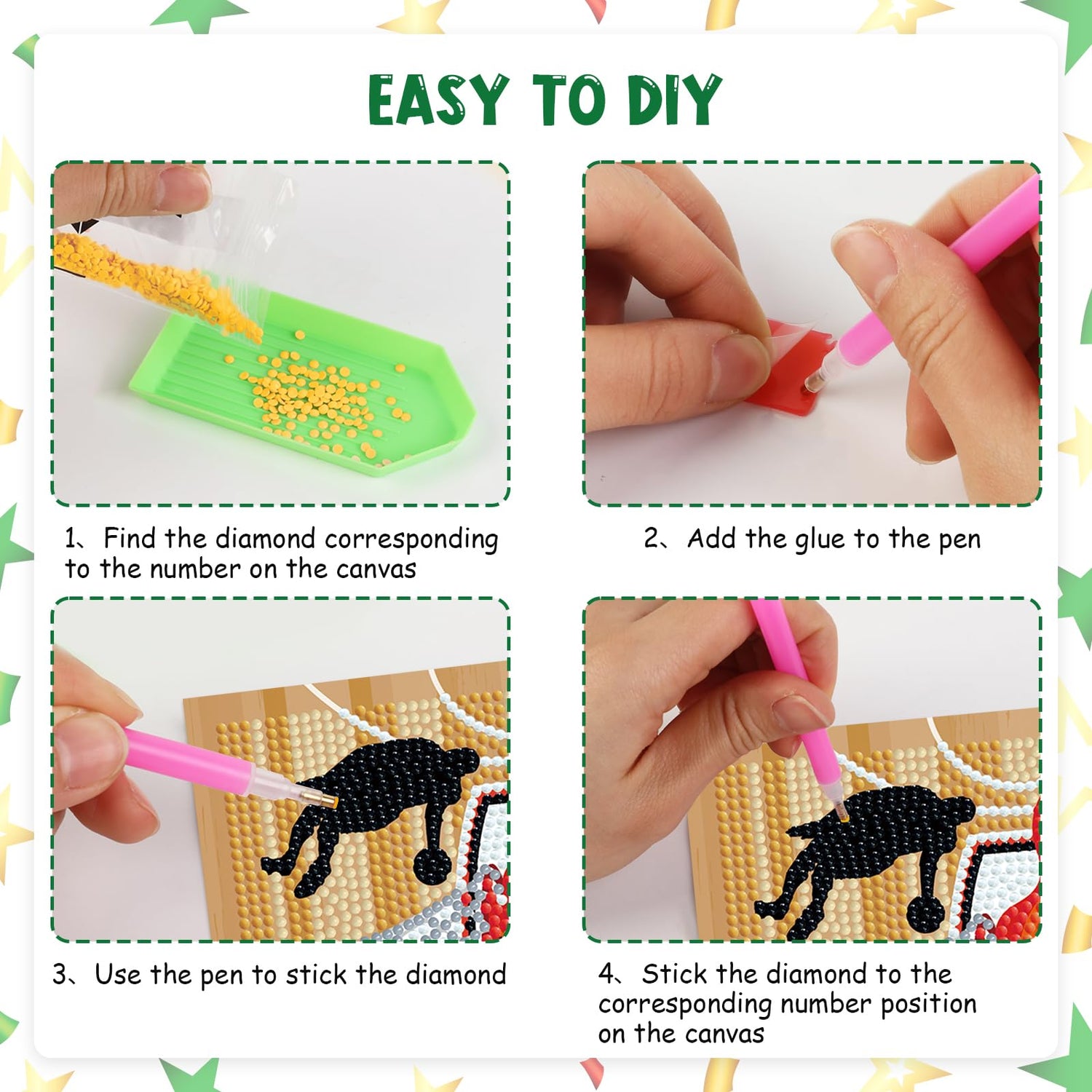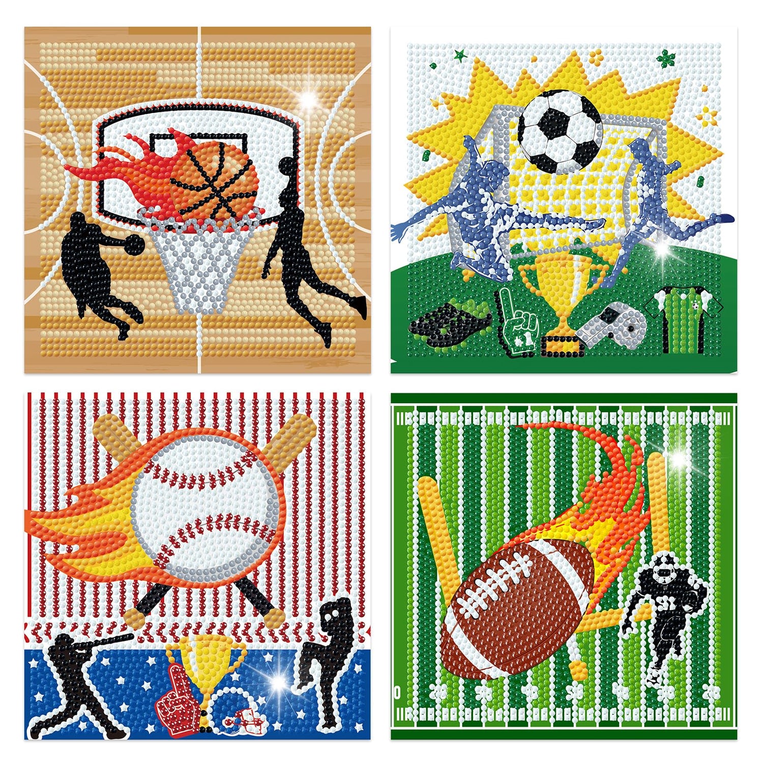 - Package Included: You’ll get 4 pcs sports element pattern canvas, a set of colorful diamond bags, four diamond tray, four wax and four pens. And there also have football, soccer, basketball and baseball pattern printed on it, which is very dazzling, very beautiful household adornment.