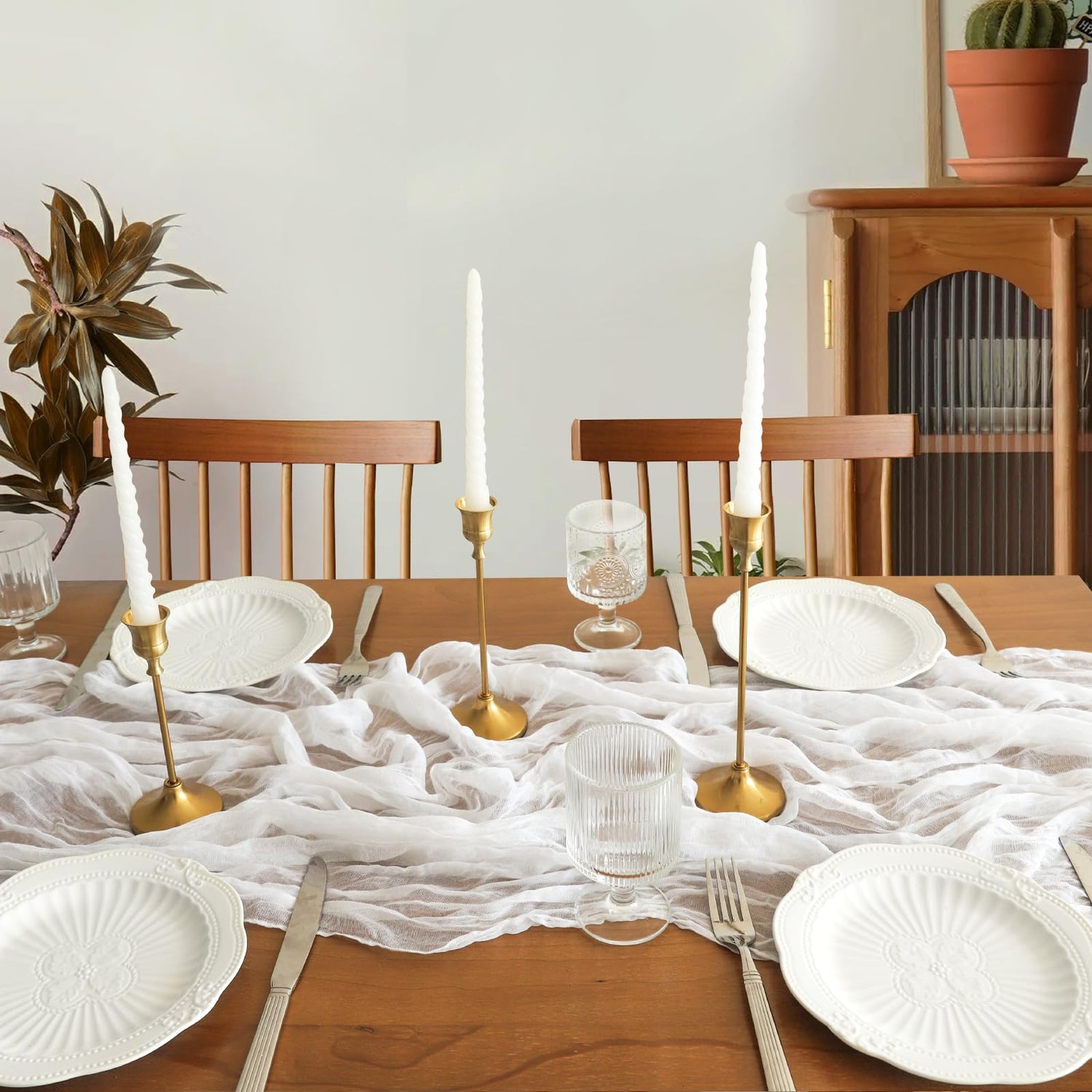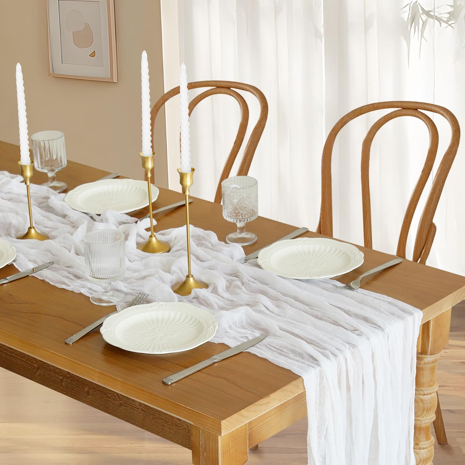 - Rustic BOHO Style: Our Ivory White cheesecloth table runner is made of polyester gauze with wrinkled gauze fabric, the wrinkles in it will and made table beautiful. These dazzling linen table runner are perfect for creating an elegant, upscale tablescape.