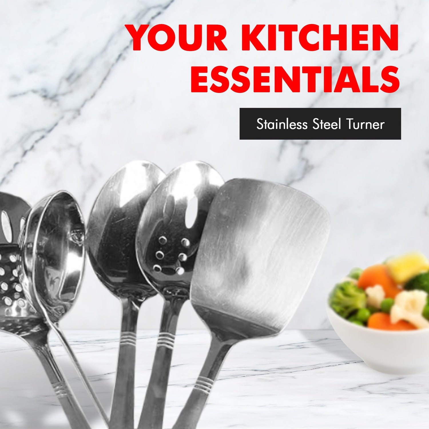 Details: This 12 1/2-inch long turner is designed from high quality heavy gauge stainless steel, has a brush finished handle with a hole in the top for easy hanging. The attractive design with a brushed handle and shiny working end is great to use for serving at events and parties. Dishwasher safe for easy, quick, and convenient cleaning after use with any foods.