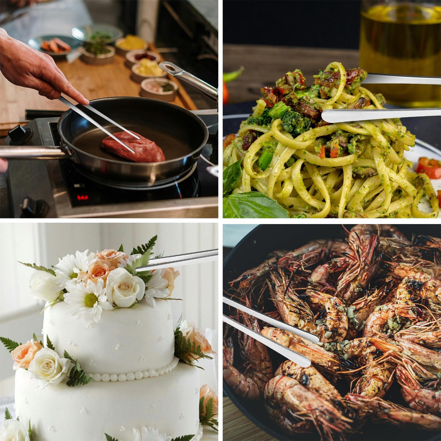 - Multiple Usage - The stainless steel tongs are great for cooking, grilling, and roasting. The plating tongs work well for cake or elevated cocktail decoration. They also function effectively as metal chef chopsticks tongs for cooking, such as salad tongs or pasta tongs. The tongs can be used for food preparation or serving food. They are ideal for spearing a pickle, stir-frying, flipping tortillas. They can be used as planting or aquarium feeding tongs, or as craft tweezers for jewelry making.
