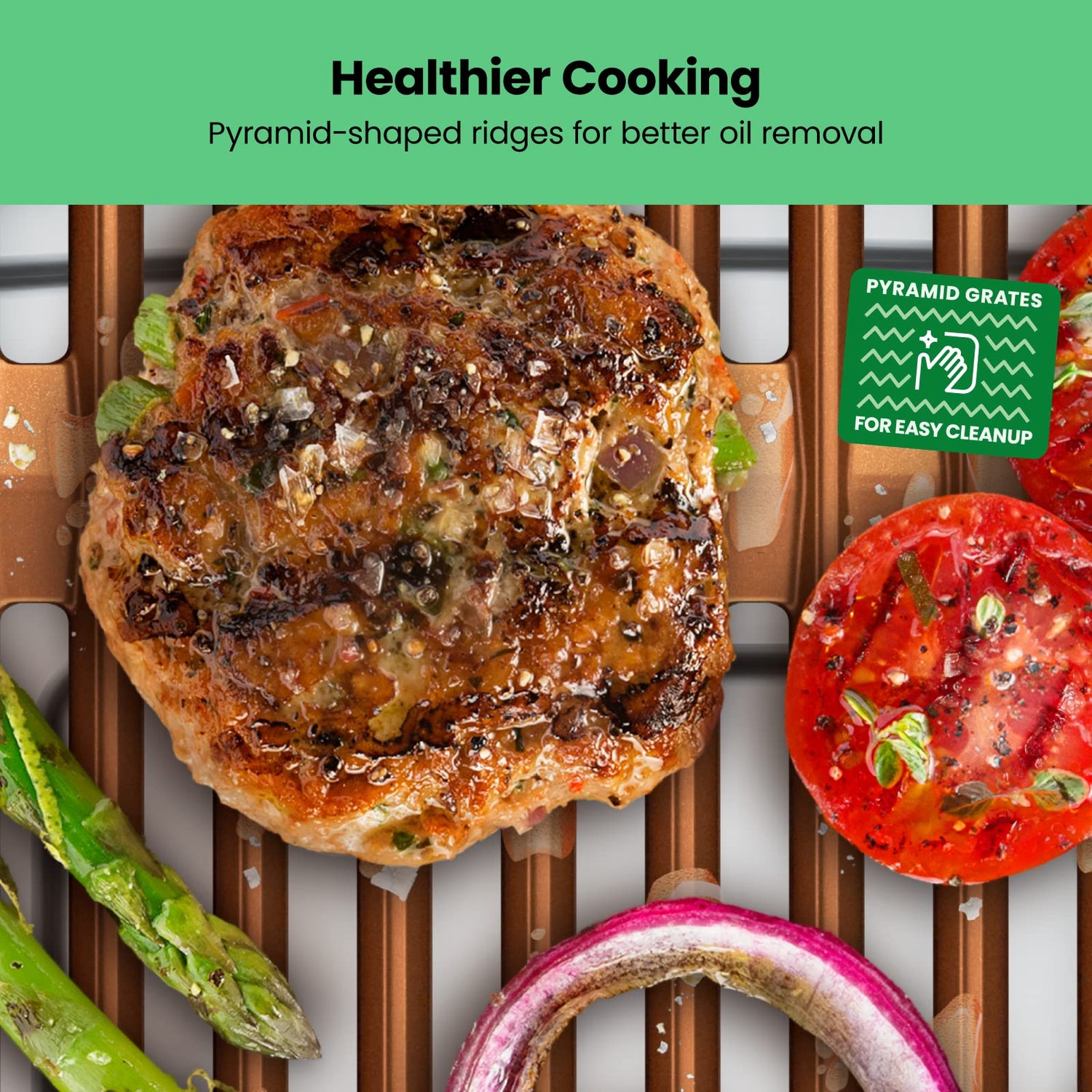 - HEALTHY, WHOLESOME COOKING: The specially designed nonstick pyramid-style grill plate and removable grease drip tray pull excess oil and grease away from your food for delicious cooking you can feel good about.