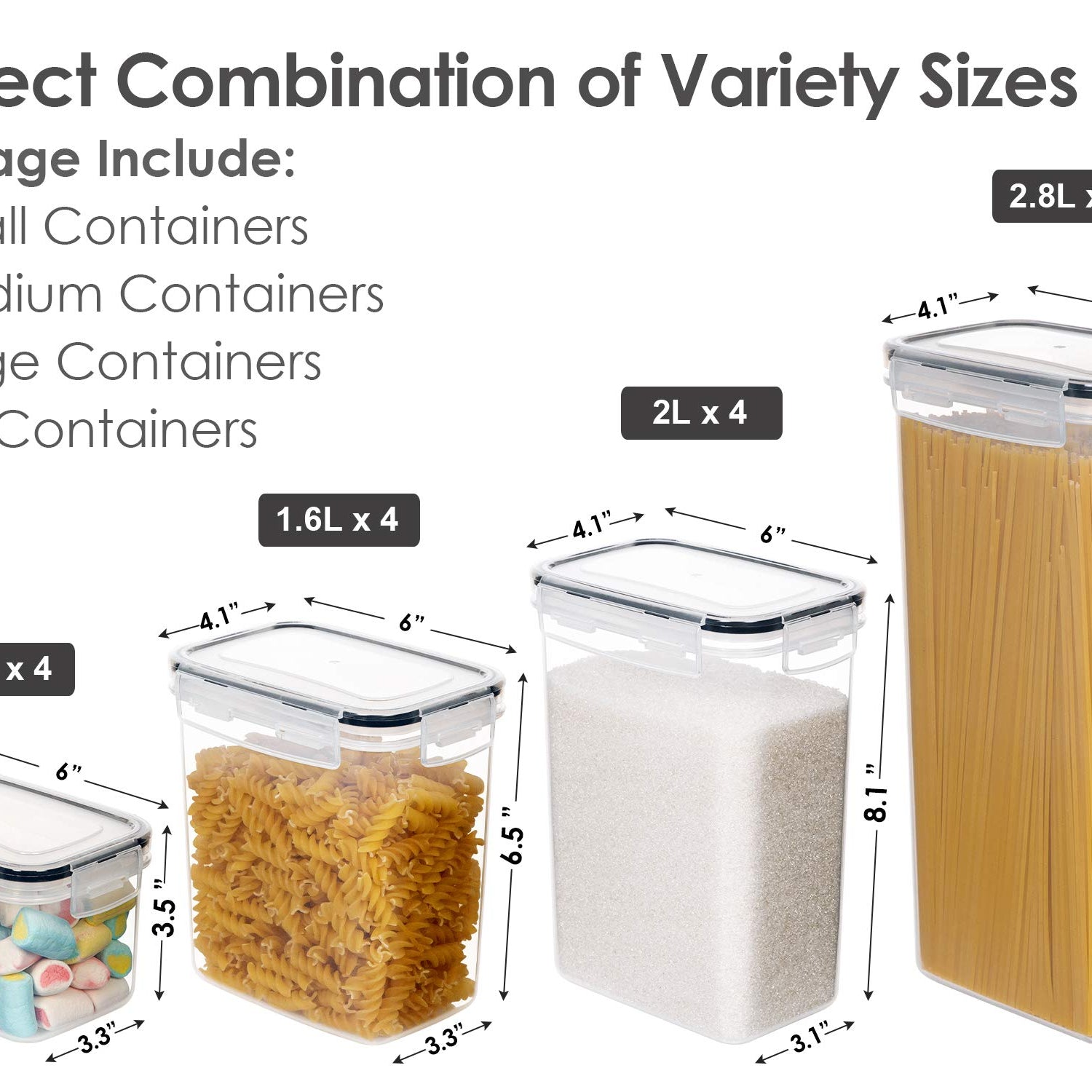- Perfect Combination of Variety Sizes — Our 14 pcs airtight food containers come in 4 sizes for all your storage needs, 2 Tall Container (2.5QT/2.8L), 4 Large Container (1.8QT/2.0L), 4 Medium Containers (1.5QT/1.6L), 4 Small Container(0.7QT/0.8L). Perfect for storing spaghetti, cereal, flour, sugar,pasta, nuts, rice, grain, beans, snacks and other dry food.
