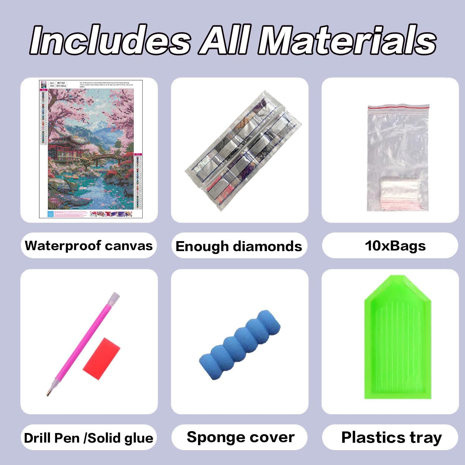 - Cherry Blossoms Diamond Art Painting: Each adult 5D diamond art kit includes 1 adhesive high-definition canvas, 1 diamond pen, 1 wax block, 1 tray, 10 sealed bags, 1 pen cap, and enough round diamonds. The kit contains all the necessary materials to help you complete your diamond art creation.