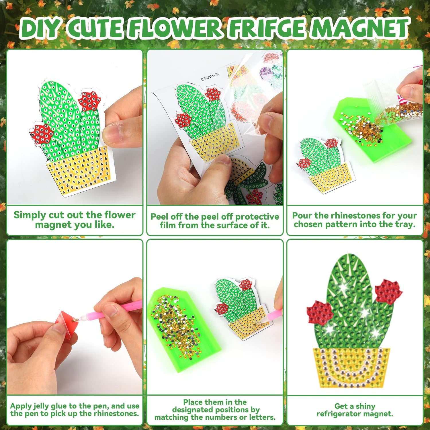 - Easy to use: Summer flower diamond painting magnets are designed to be user-friendly for adults and kids. Simply cut out the flower magnet you like, then peel off the peel off protective film from the surface of it, pour the rhinestones for your chosen pattern into the tray, apply jelly glue to the pen, and use the pen to pick up the rhinestones. Then, place them in the designated positions by matching the numbers or letters—making it a straightforward and convenient process.