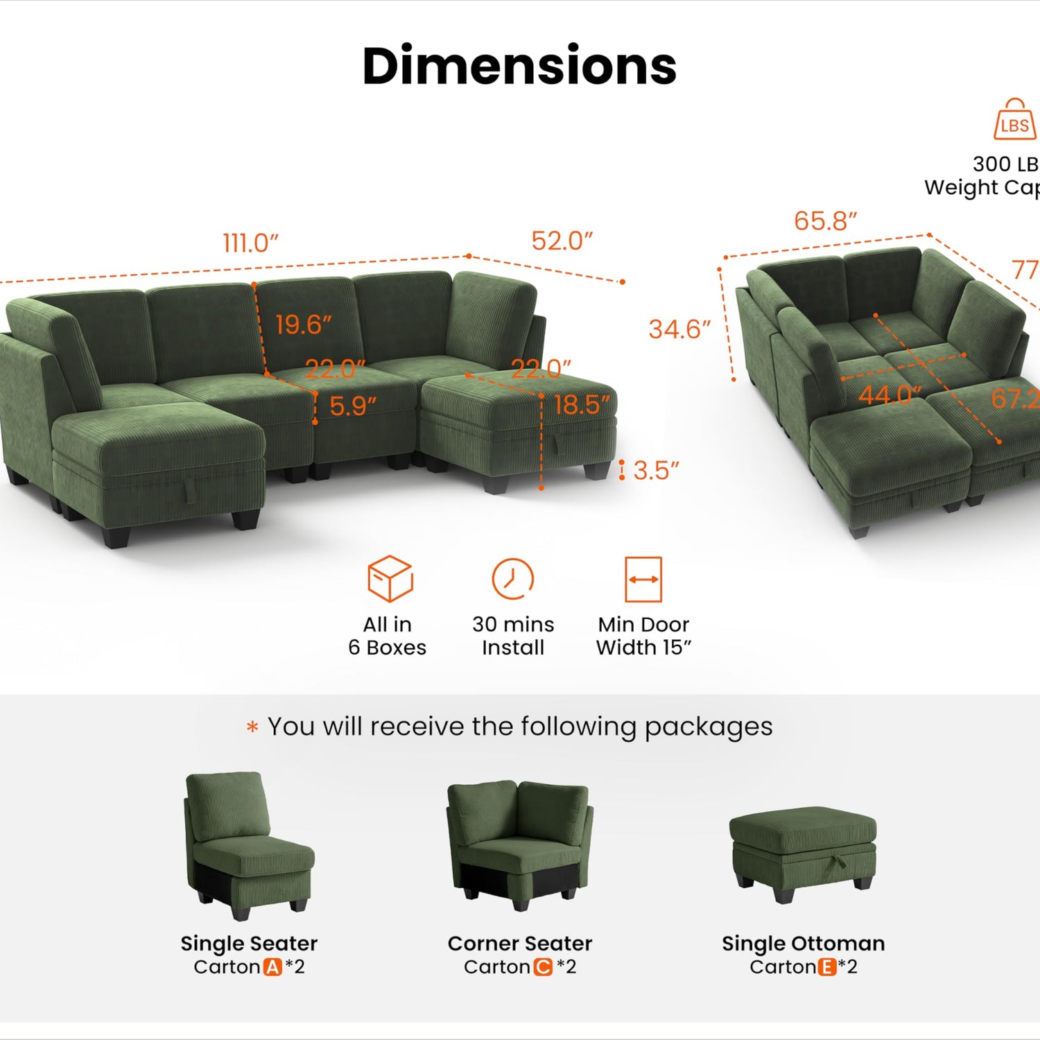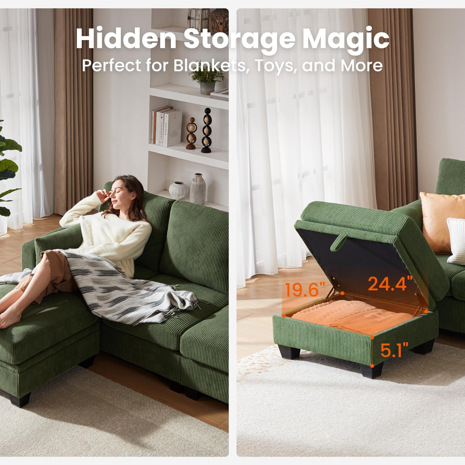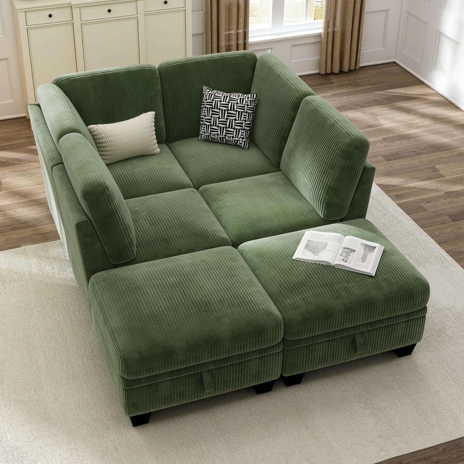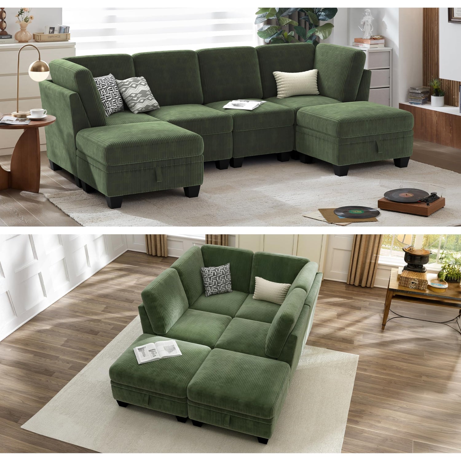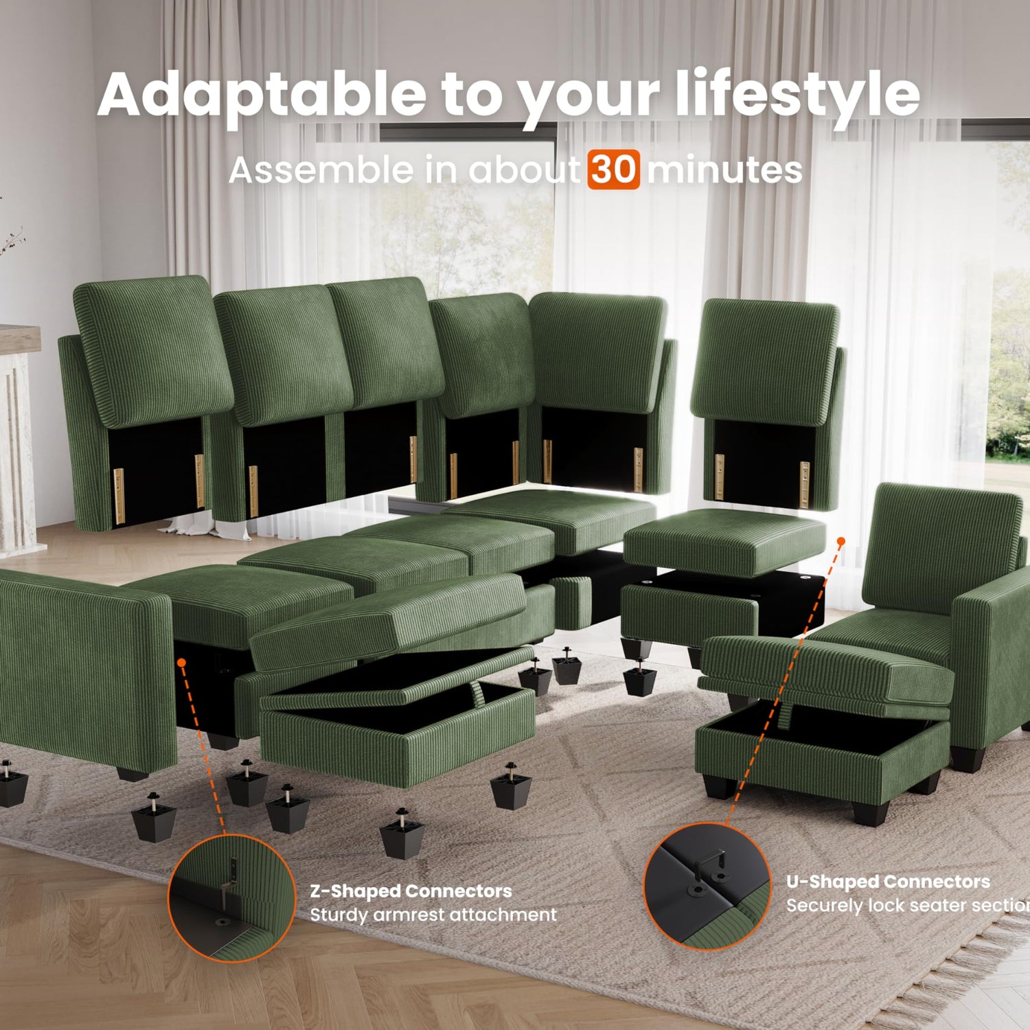 CHIC HOUSE Modular Sectional Sofa Corduroy Couch, Customizable U-Shaped Sofa with Storage Ottoman, Reversible Chaise for Living Room, Oversized L-Shaped Sofa Set (Green, 6 Seater Compact Sleeper)