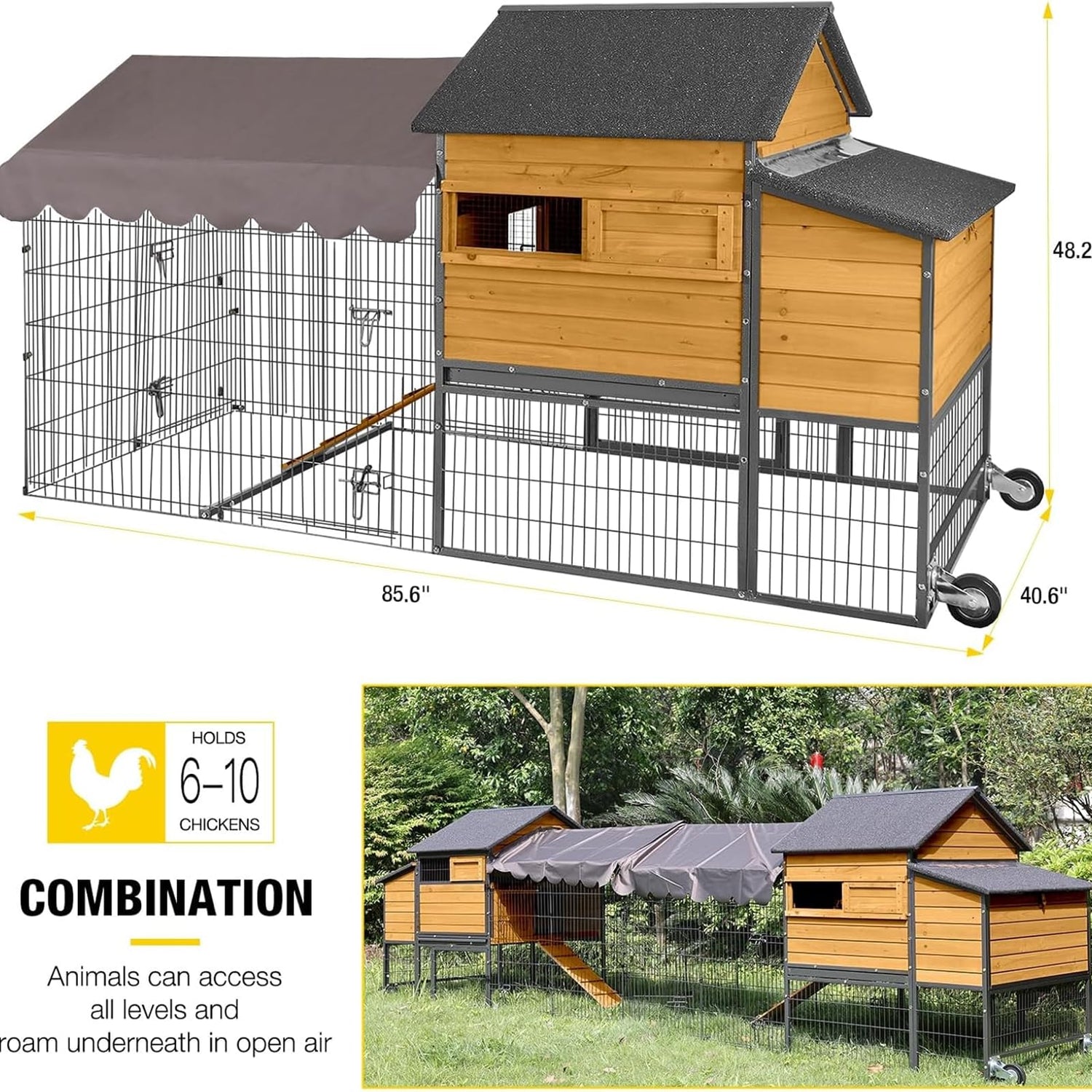 - 【Large Chicken House】Our chicken house comes with nesting box, resting area and runging area,perfect for 6-8 chickens.Overall Dimensions: 85.6"L x 40.6"W x 48.2"H.