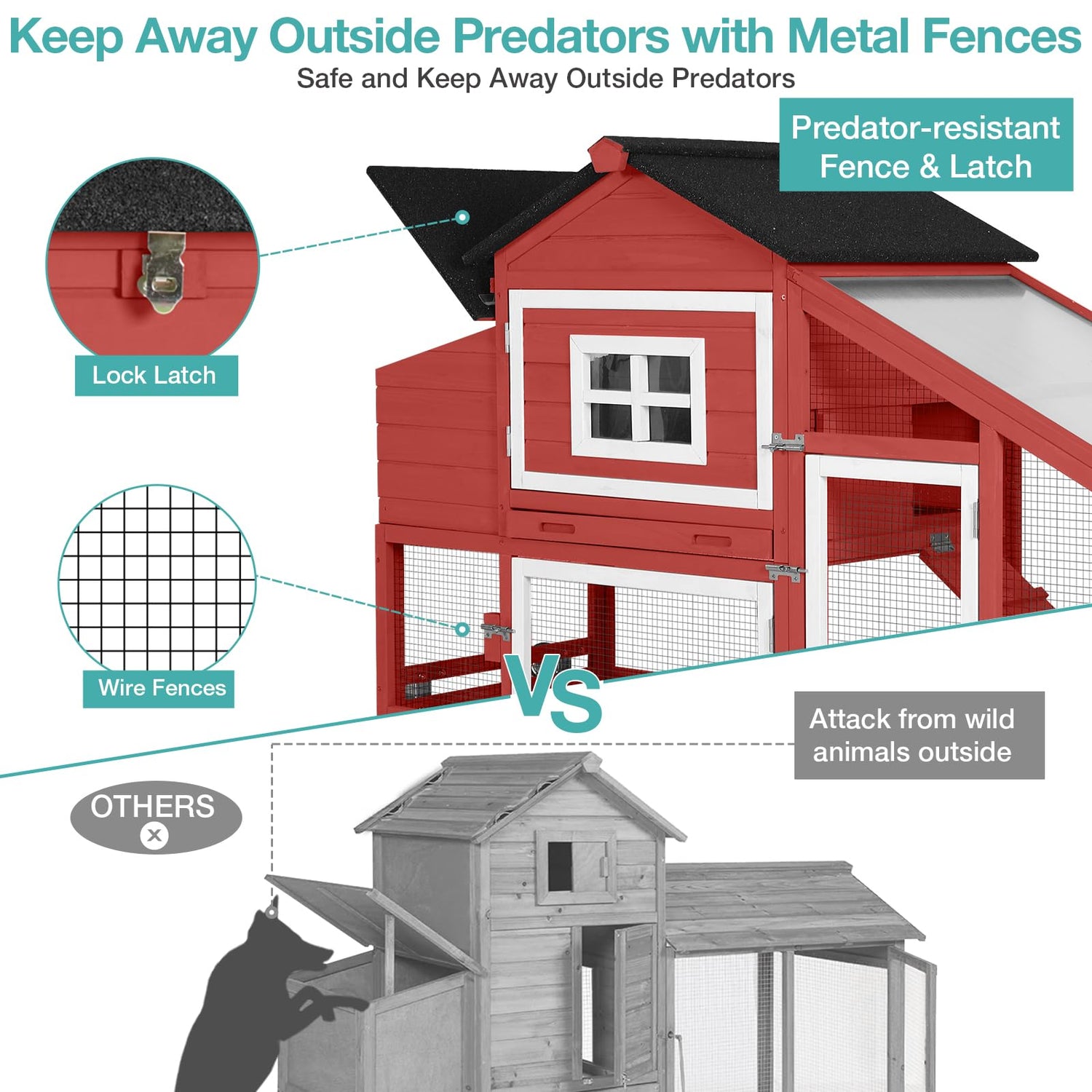 - 【Safe & Comfortable Living Space】: This hen house is designed with the comfort and safety of your poultry in mind. It features 2 nesting boxes for egg laying or hatching, a leakproof pull-out tray for easy cleaning, a perch for roosting or standing, and an anti-slip ramp that provides easy access to the living room. Plus, a large outdoor run area allows your chickens to freely roam and play