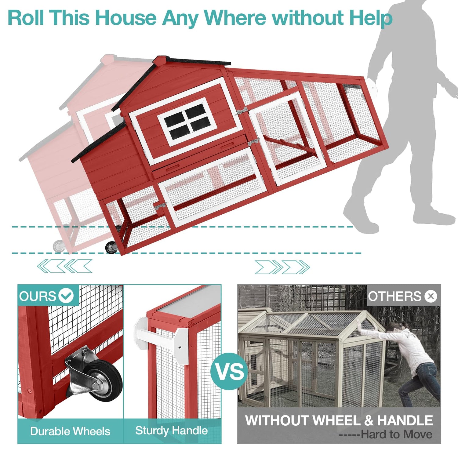 - 【Easy Movement】: Two high-quality wheels and a sturdy handle make this backyard chicken house easily movable. Just lift the handle and move the coop to any spot you prefer. This feature allows you to easily change the location of the coop based on your needs, without requiring additional help