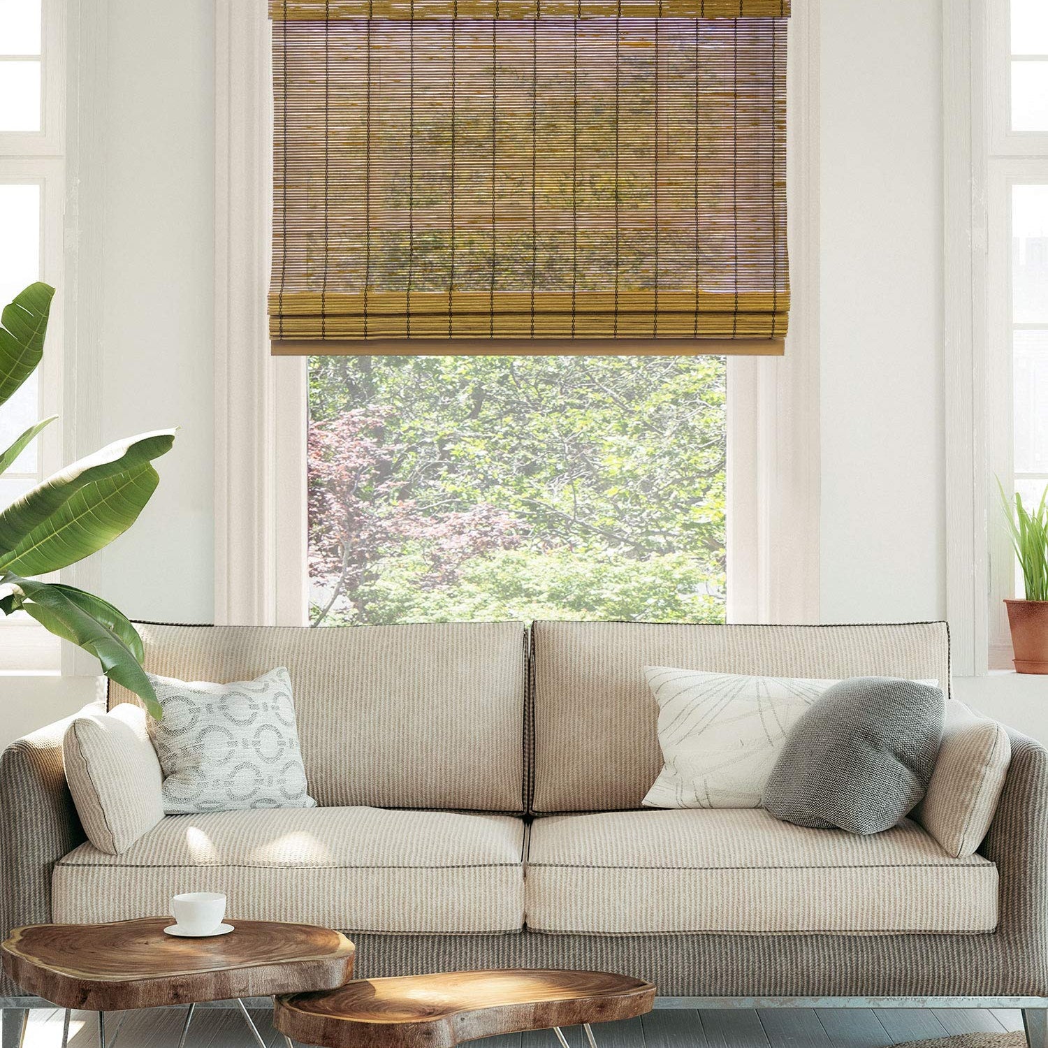 Crafted from durable bamboo, these cordless shades not only look chic but also offer a unique design element that suits various settings. Whether you're looking to dress up indoor windows, provide privacy on French doors, or add a touch of elegance to your porch, these Roman shades are versatile enough to meet your needs.