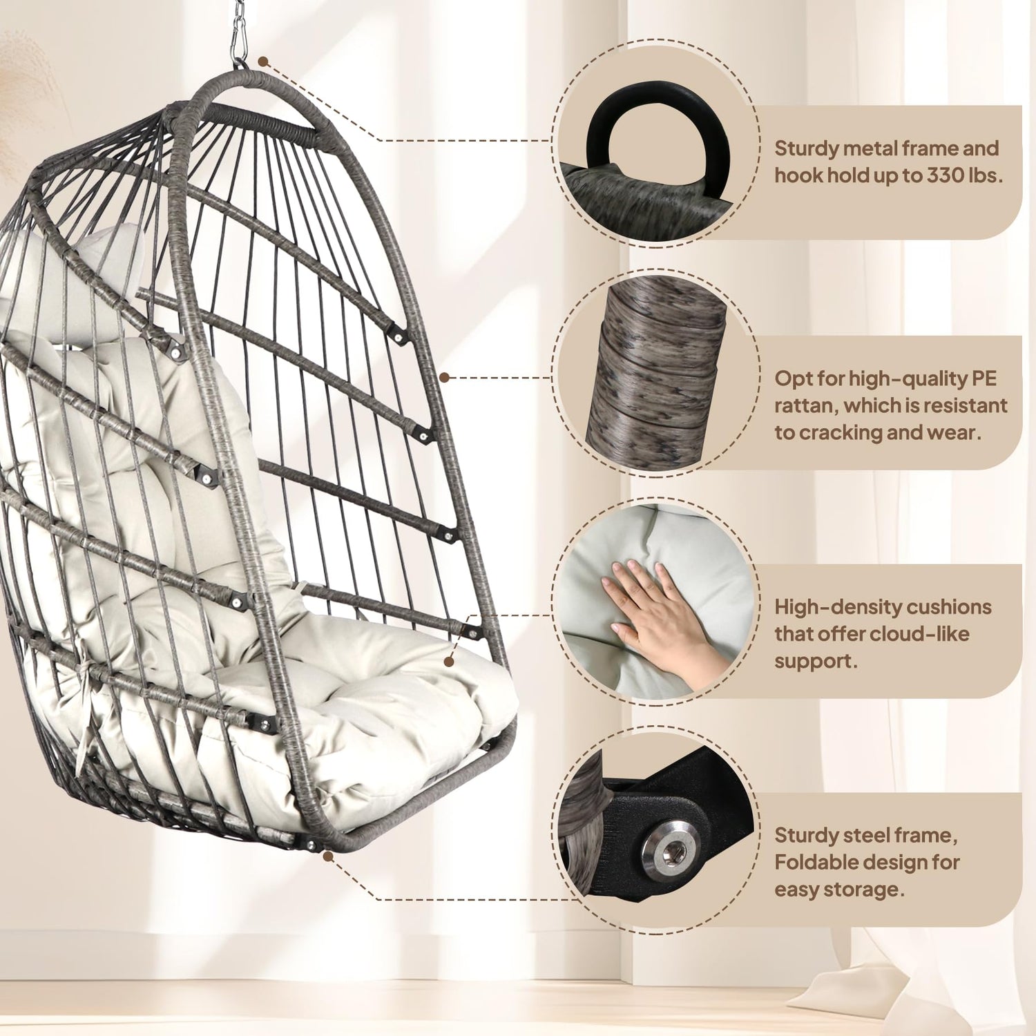 Chihee Egg Chair with Ultra Strong Stand and Cushion Foldable Wicker Rattan Hanging Chair Indoor Outdoor Patio Lounging Chair 330 lbs Capacity Balcony Porch Bedroom Garden