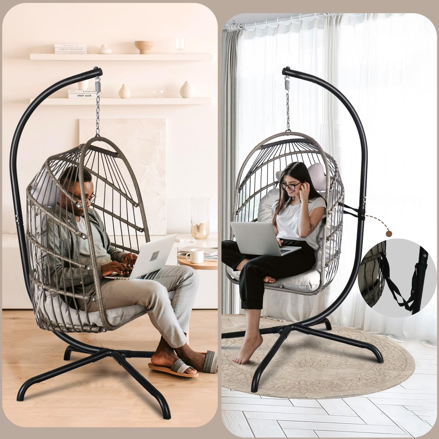 - Perfect Enjoyment:Make a reading nook inside or outside of your home in this simple, cocoon-like egg chair. This unique swinging Chair is the perfect addition to any space outside, a backyard patio, deck, in a sun-room or garden, or near a pool, or outdoor Bar. It provides an essential security that safety strap attaches the seat to the stand`s vertical shaft.