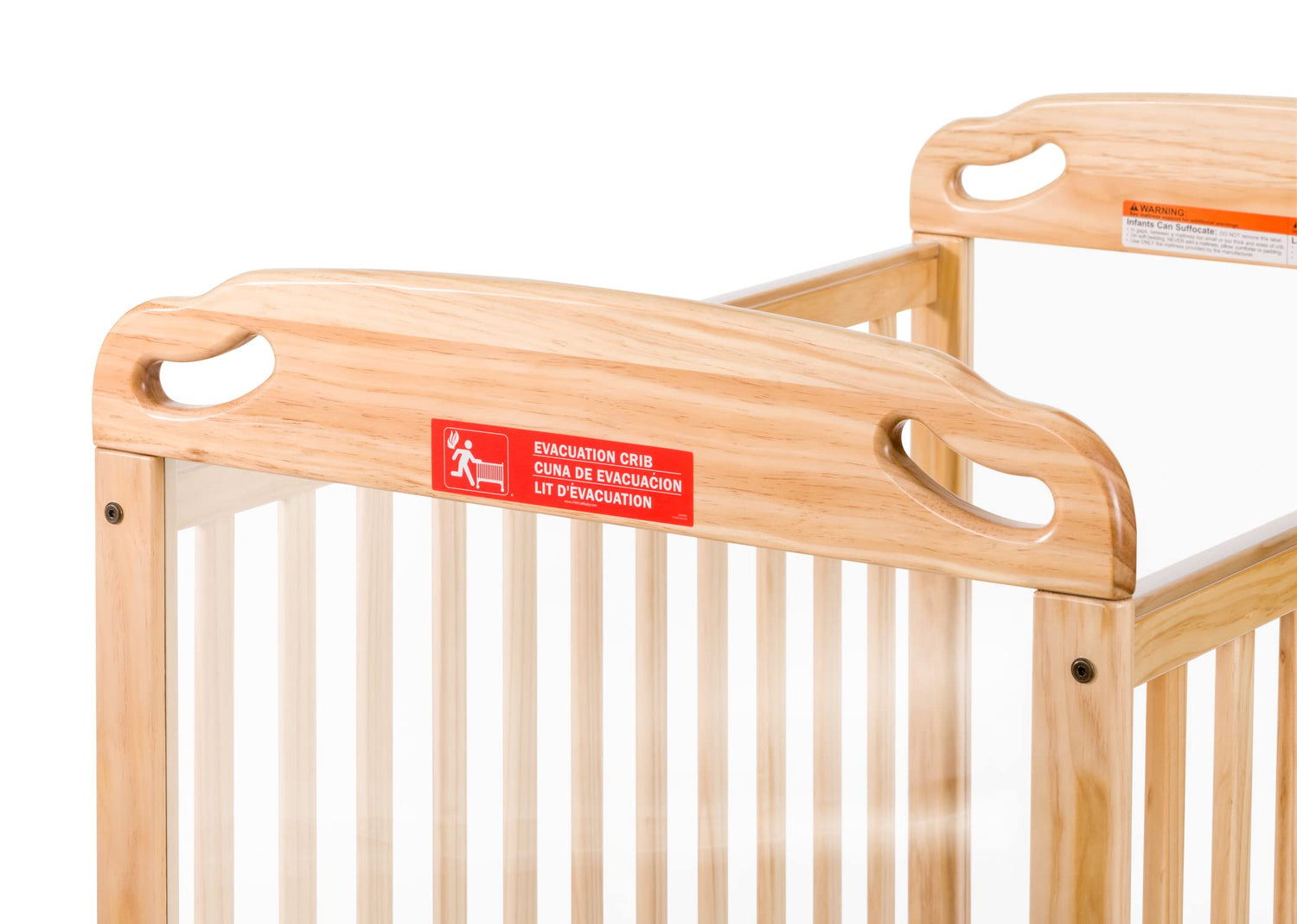 • Evacuation icons are clearly labeled across the crib to easily identify to caregivers that this crib is suitable for evacuation use.