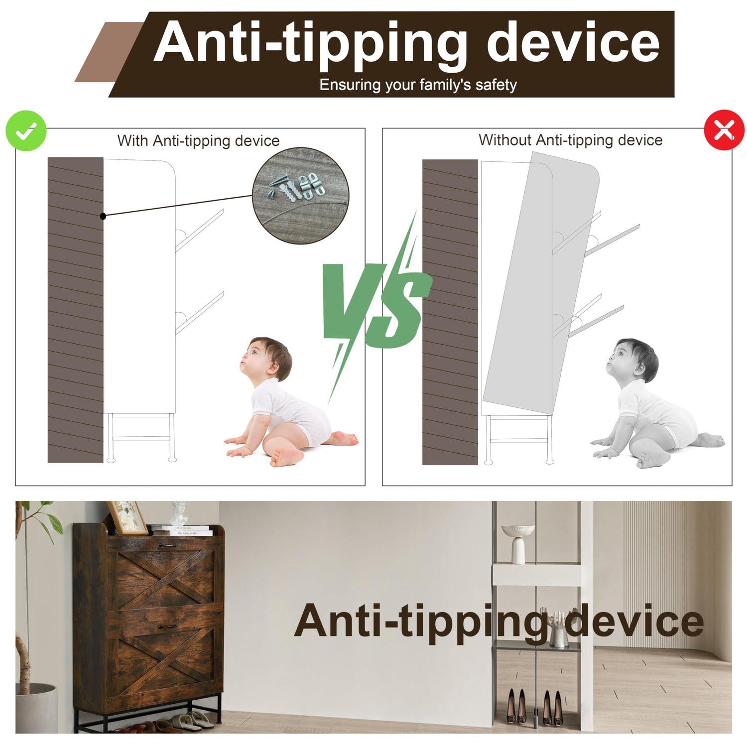 - 【Sturdy Construction】The shoe storage cabinet is made of MDF. It has a stable structure and strong load-bearing capacity. With the anti-tip device, you can attach the shoe cabinet to the wall to prevent tipping and keep children safe. Equipped with detachable black hooks, you can also install it on the side of the shoe cabinet, for hanging umbrellas, bags and so on, which is convenient for you to go out.