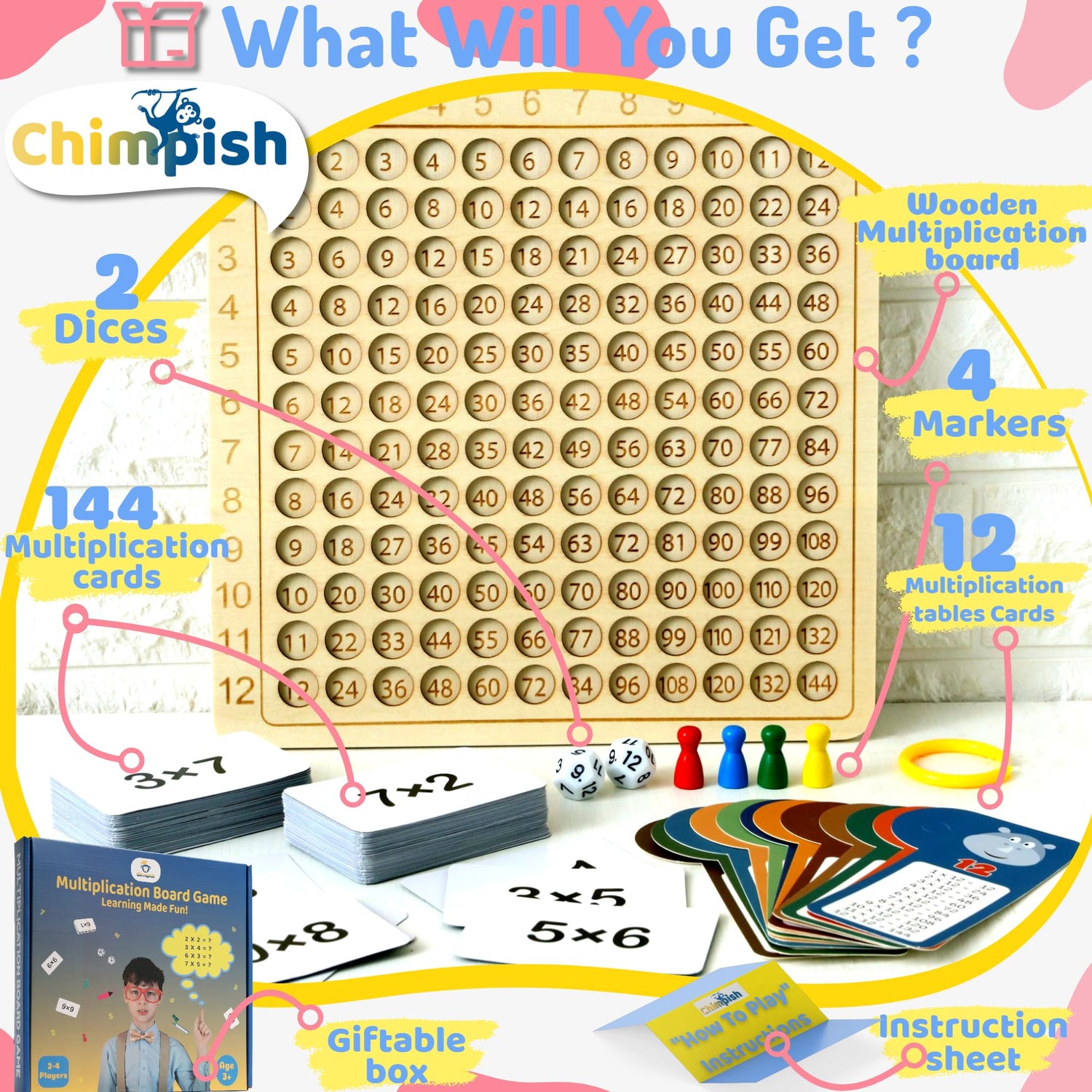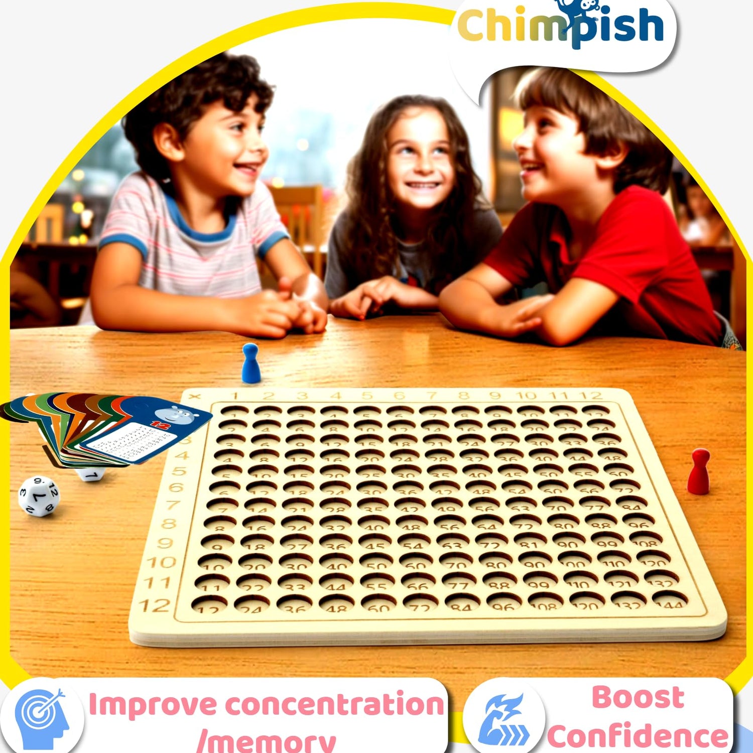 Chimpish Multiplication Games, 12x12 Wooden Montessori Multiplication Board Game, Larger Size Times Table, Montessori Math Learning Materials, Educational Toy for Toddlers, Preschool Gifts for Kids